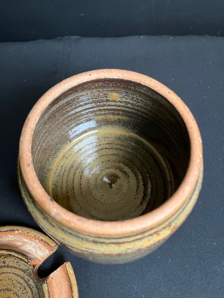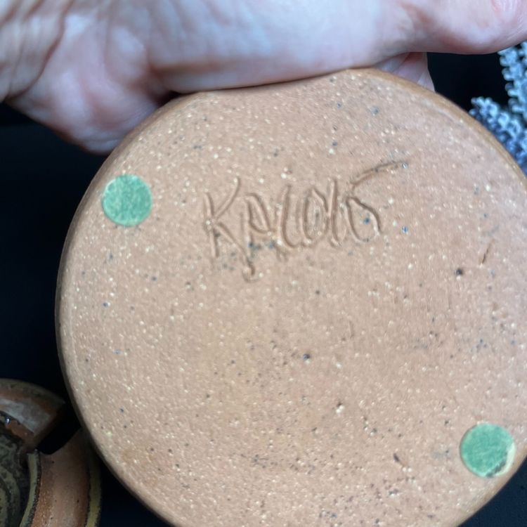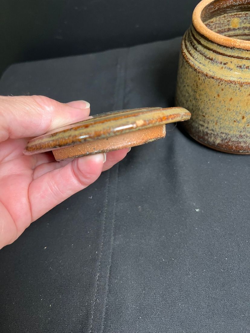 Signed-Unable to distinguish signature. Has flea bite on edge of lid on outside-see pic. Measures approx 3.25"H, 4" Diameter at base, 3" diameter at opening, 14.3 Oz