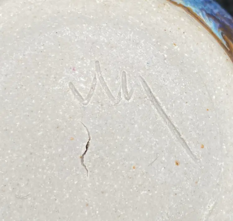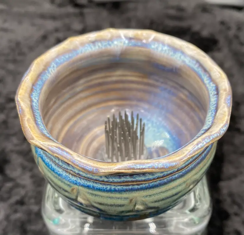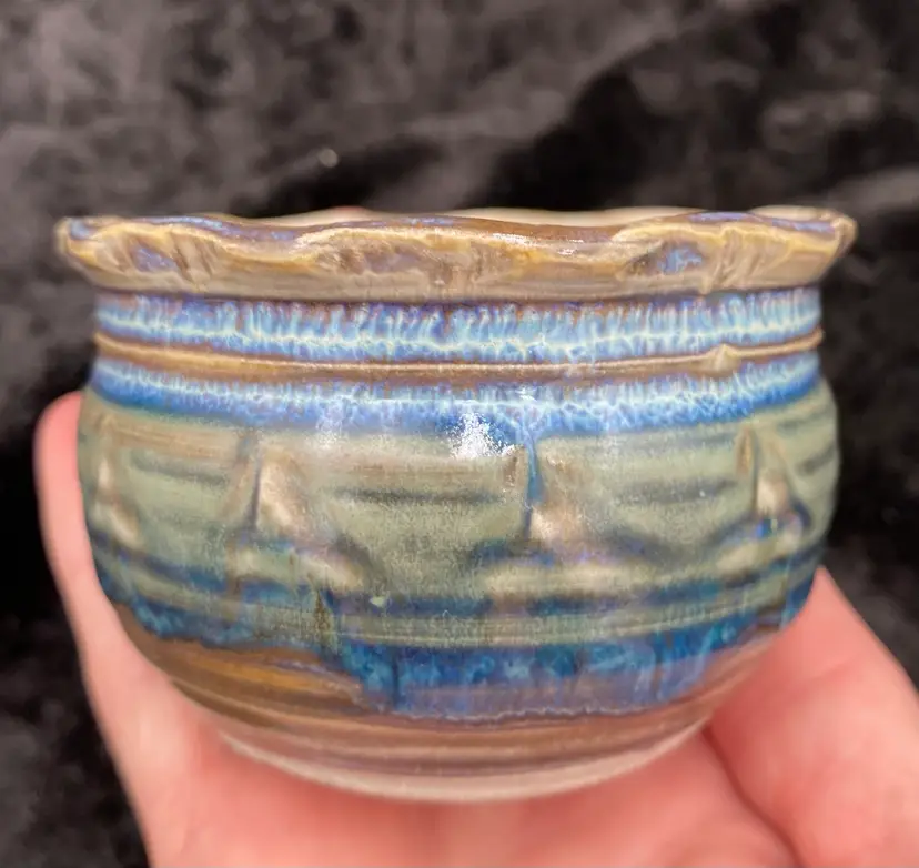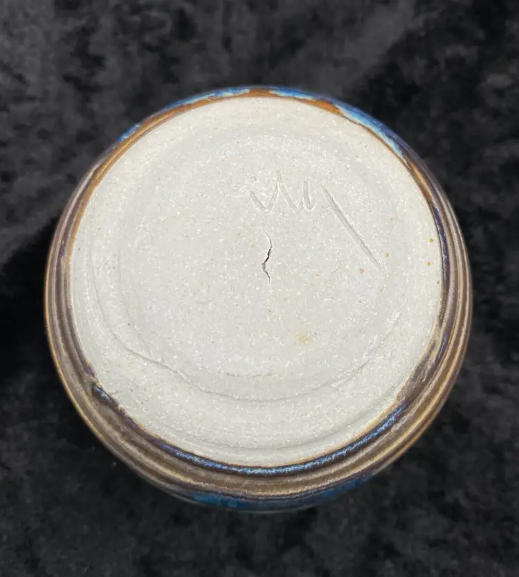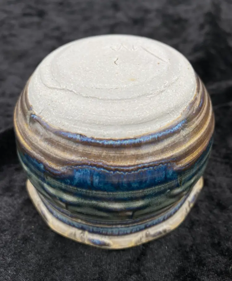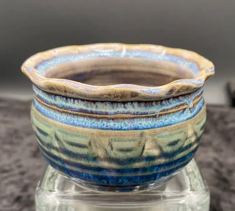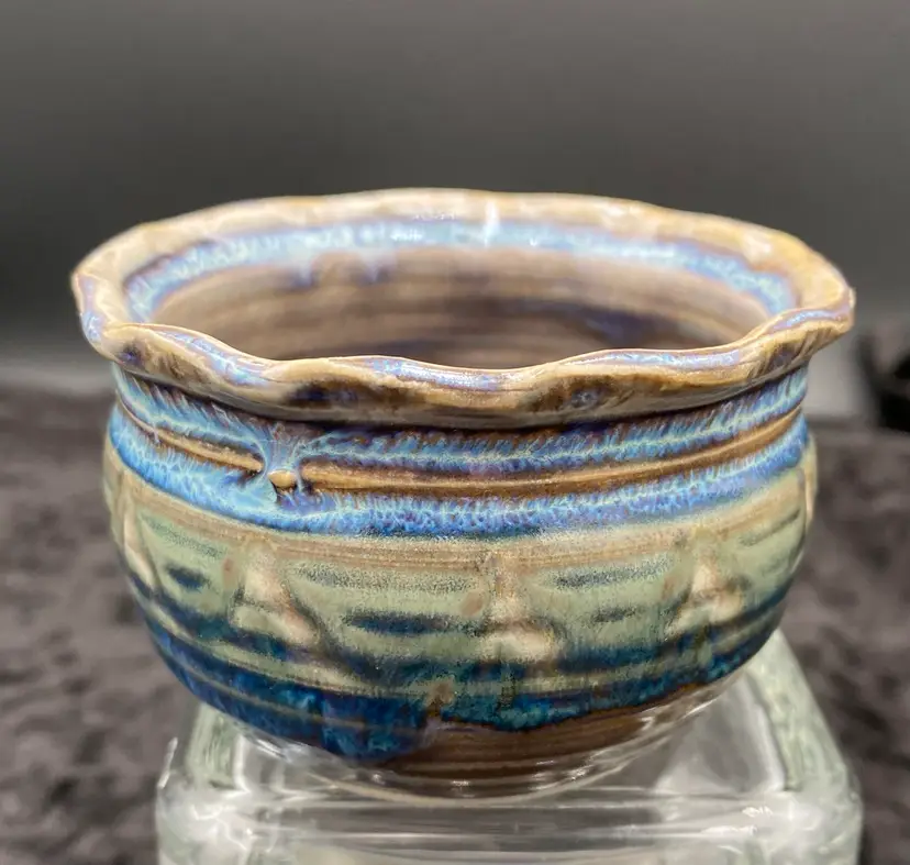 Studio Pottery Ikebana Mini-Vase w/Flower Frog, Signed, Blues/Green/Browns Glaze