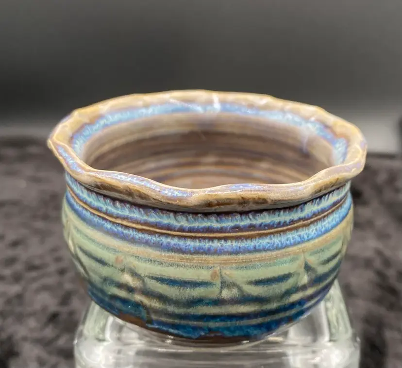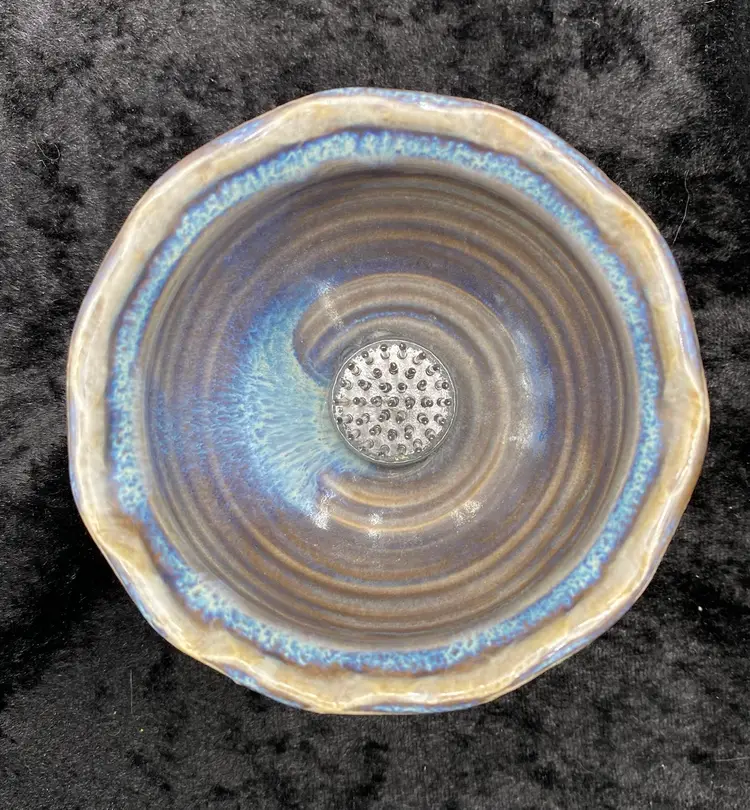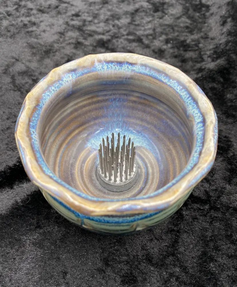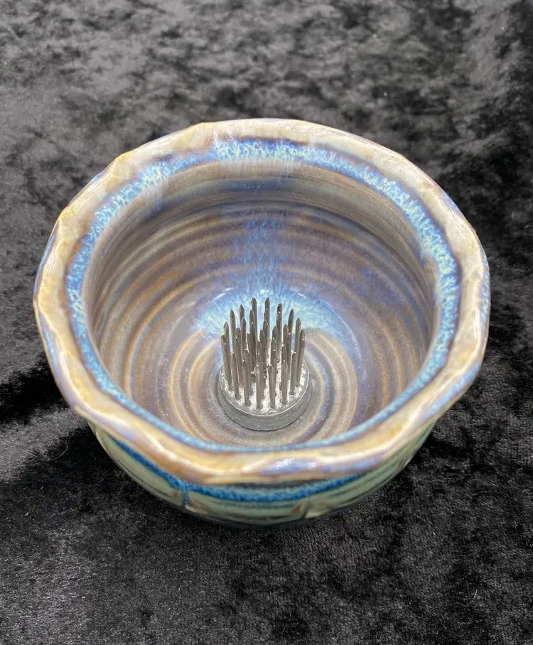 This studio pottery Ikebana Mini-Vase with Flower Frog is a unique and contemporary piece signed by the artist. The vase features a drip glaze finish in shades of blues, greens, and browns, with an abstract design and a ruffled rim. Handmade in the United States in the 21st century, this original piece measures 2.25 inches in height and 3.25 inches in width, incorporating a flower frog for added functionality. With a lead-free glaze, this mini-vase is a stylish and functional addition to any decor.