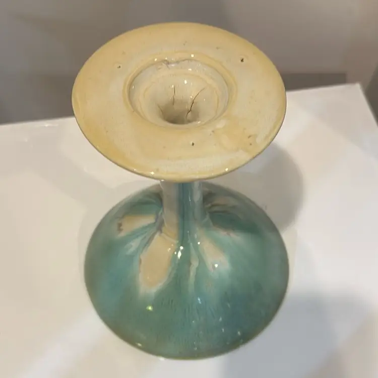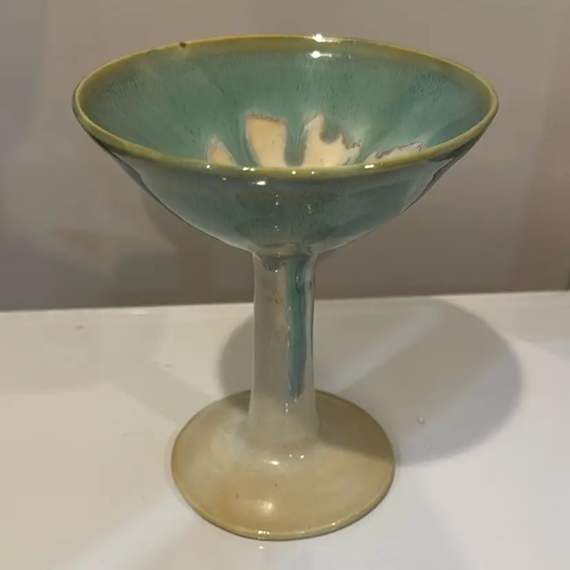 Beautiful studio pottery pedestal bowl. Awesome shades of green. Measure measures 6 inches tall. No chips or cracks.