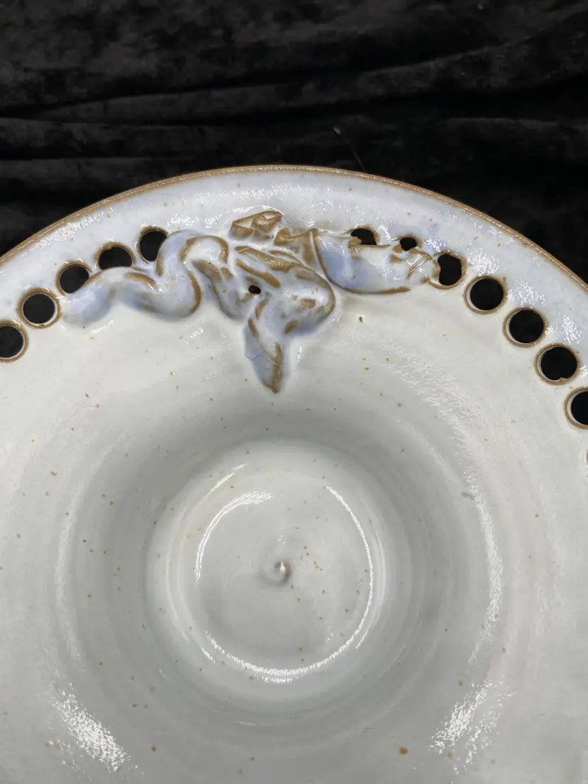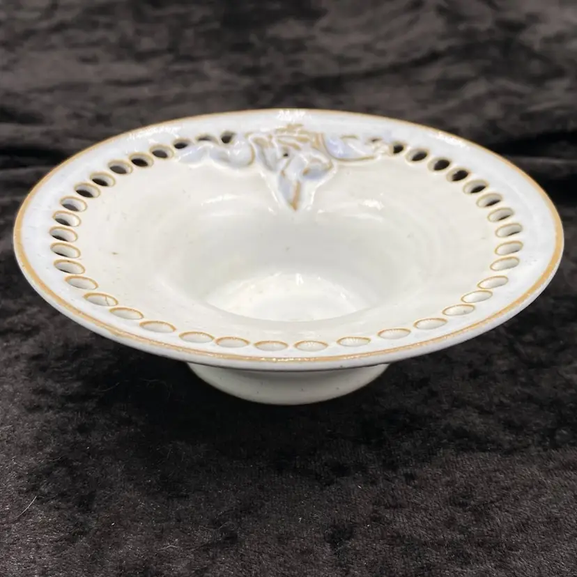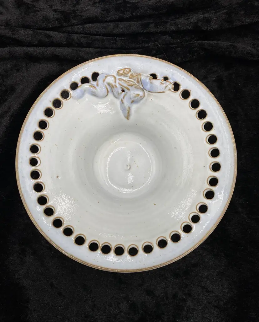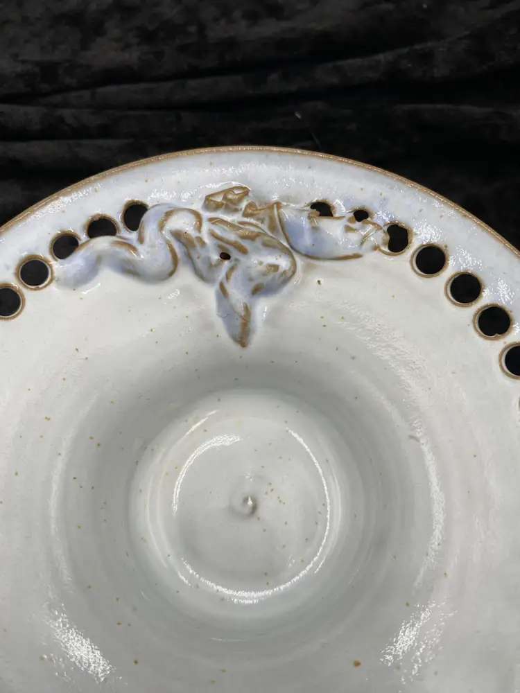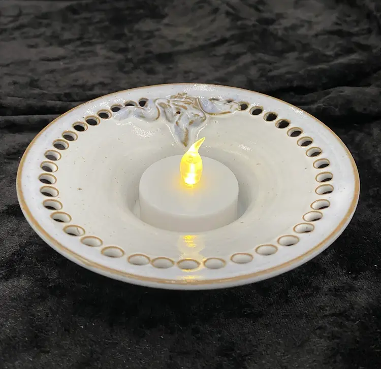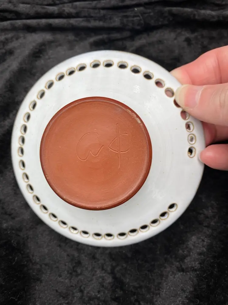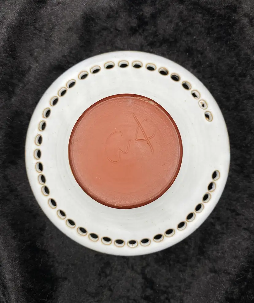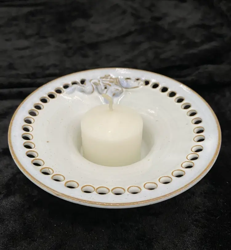 This studio pottery Red Clay Reticulated Candle Holder is handcrafted in the United States with a majolica glaze and ribbon detail. The candle holder features reticulated circles around the edge, with an applied ribbon on one area. The white majolica glaze shifts towards a light blue as it moves towards the edge. Signed by the artist, this art pottery piece is suitable for pillar, votive, mini, and tea light candles, making it a versatile and stylish addition to your home décor.