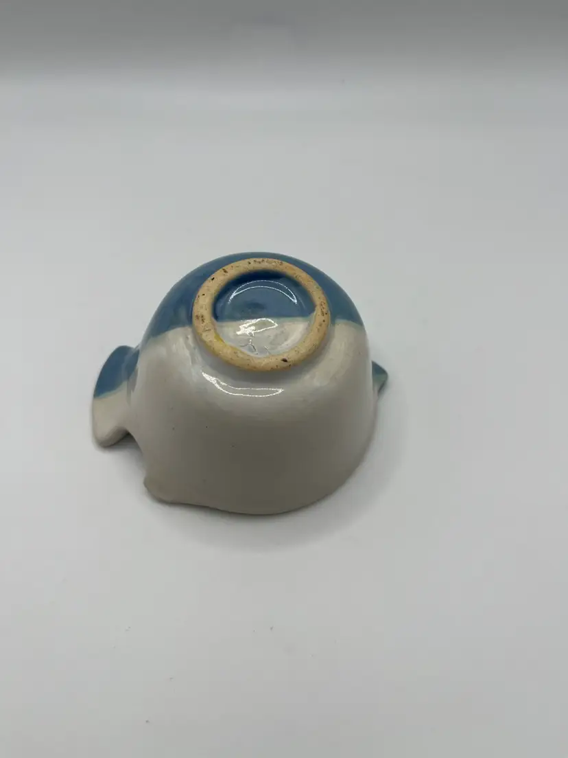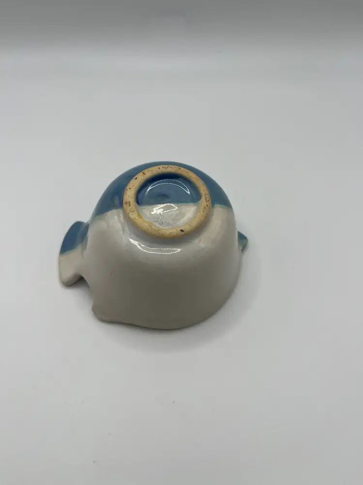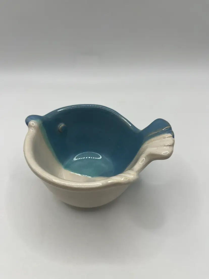 Adorable studio pottery trinket dish measures approximately 3” x 3 3/4” and 2” height. No chips or cracks
