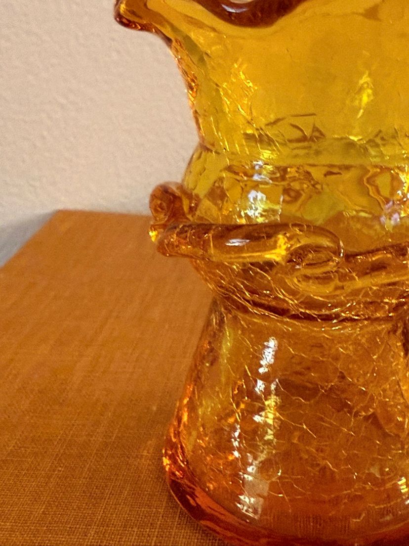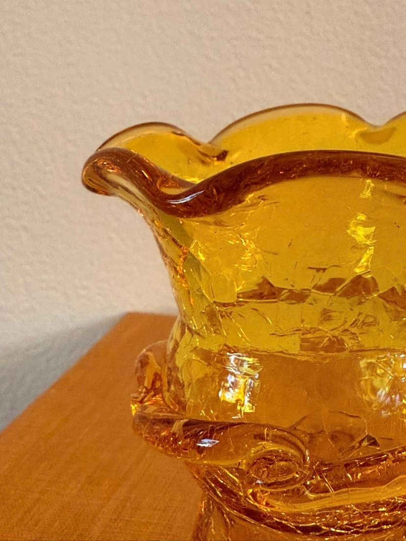 It features a striking, rich amber/orange color and a fantastic crackle glass texture that catches the light beautifully. You can see the hand-applied glass ribbon encircling the middle, adding to its unique charm. The top edge is gently ruffled—a really sweet detail.