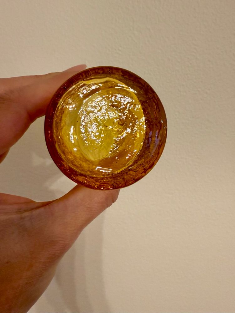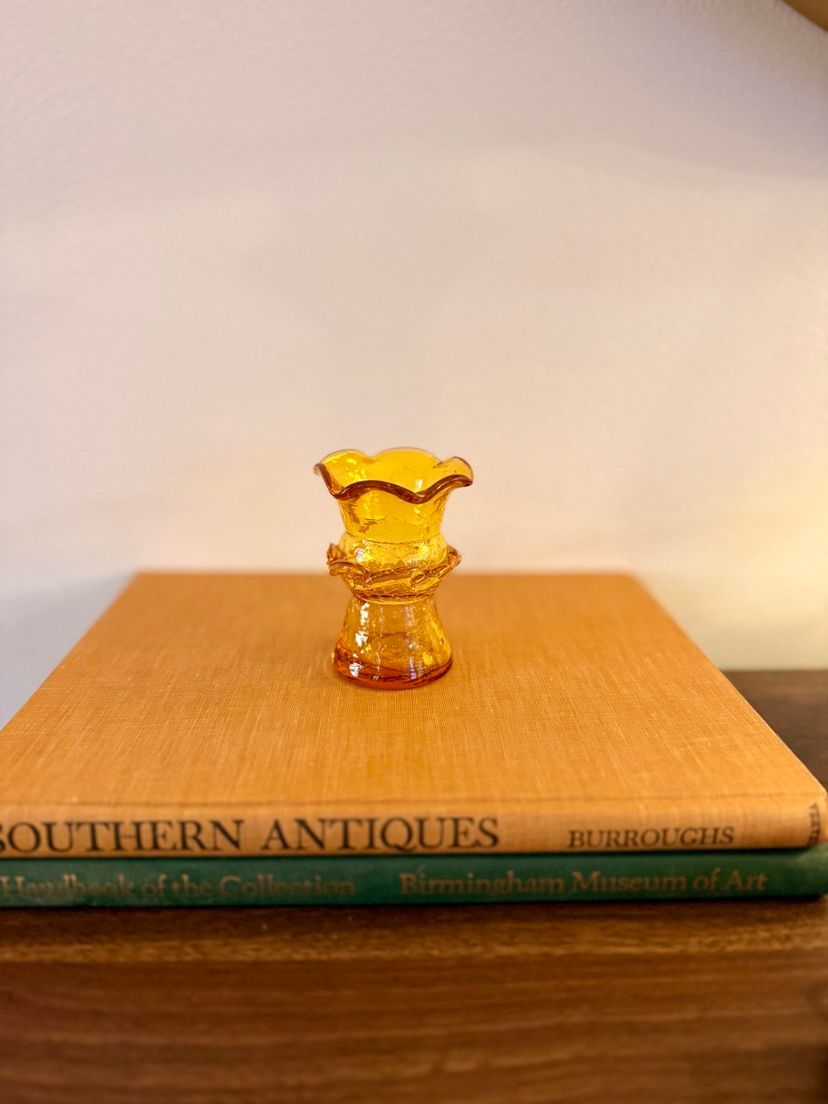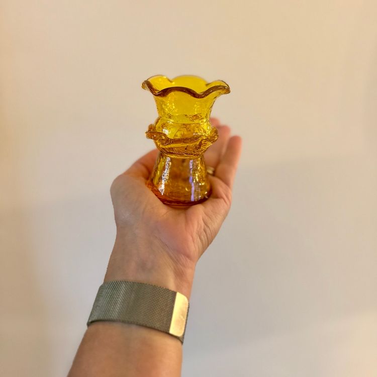 This little vase is a must-have for: Mid-Century Modern (MCM) decor lovers Collectors of Art Glass or Crackle Glass Anyone looking for a bright pop of color on a bookshelf or window sill! It’s small and perfect for a single bud, a tiny air plant, or just displayed as a piece of art glass on its own.