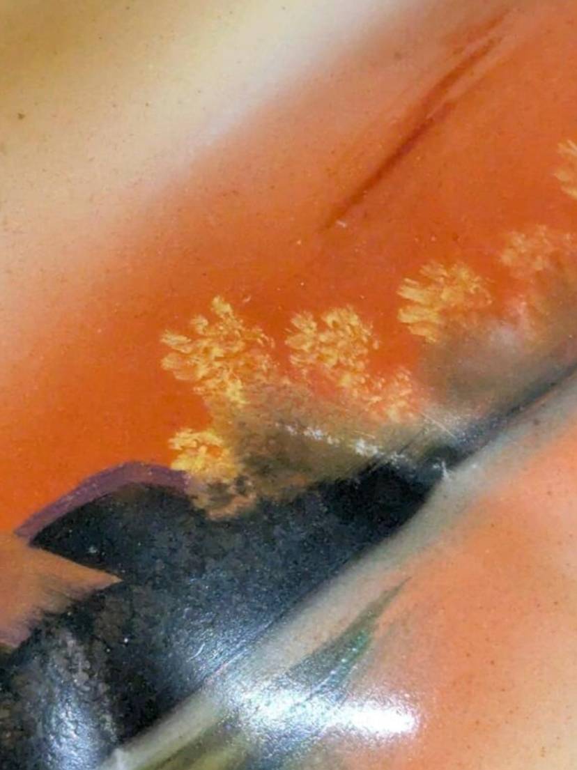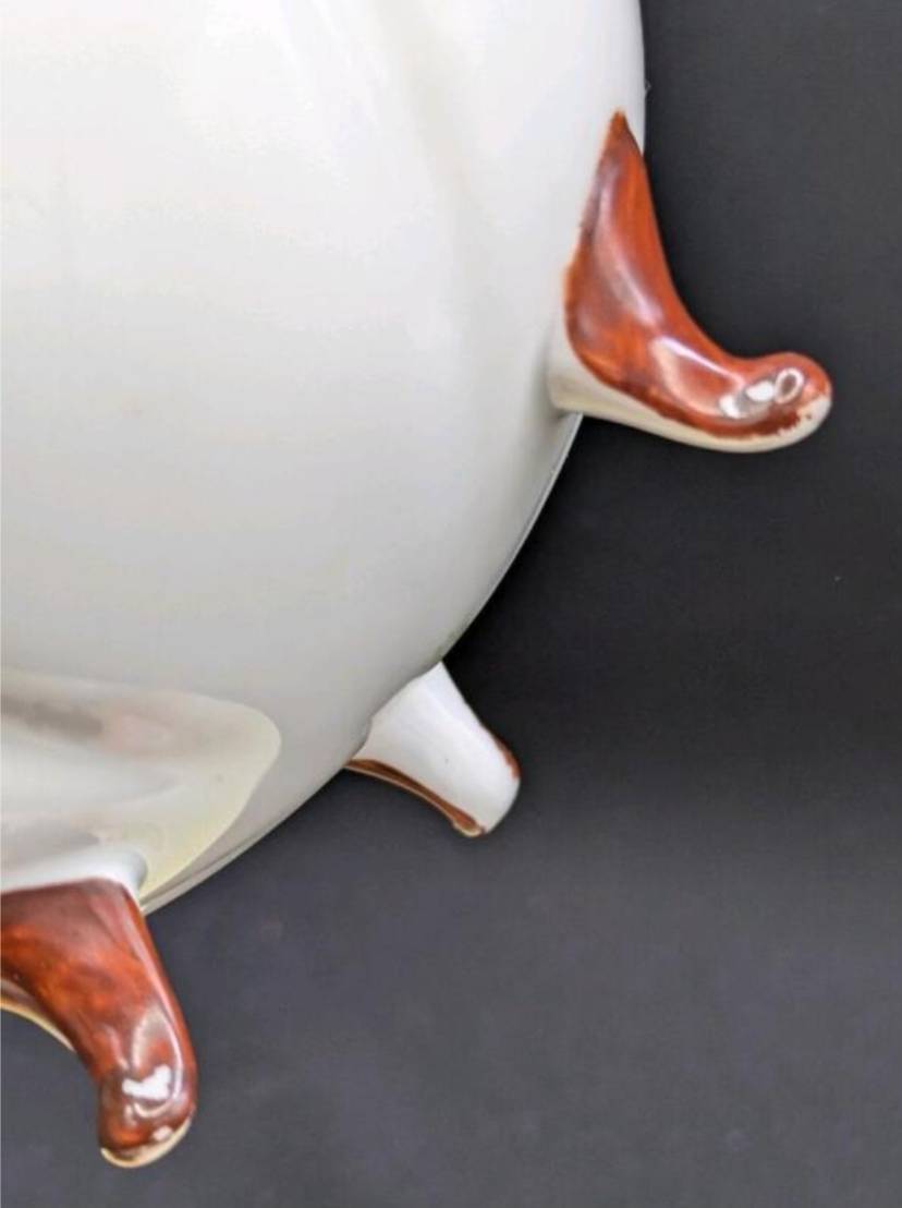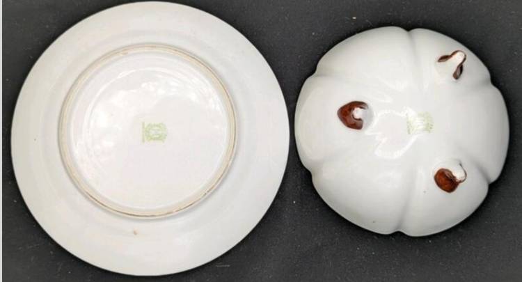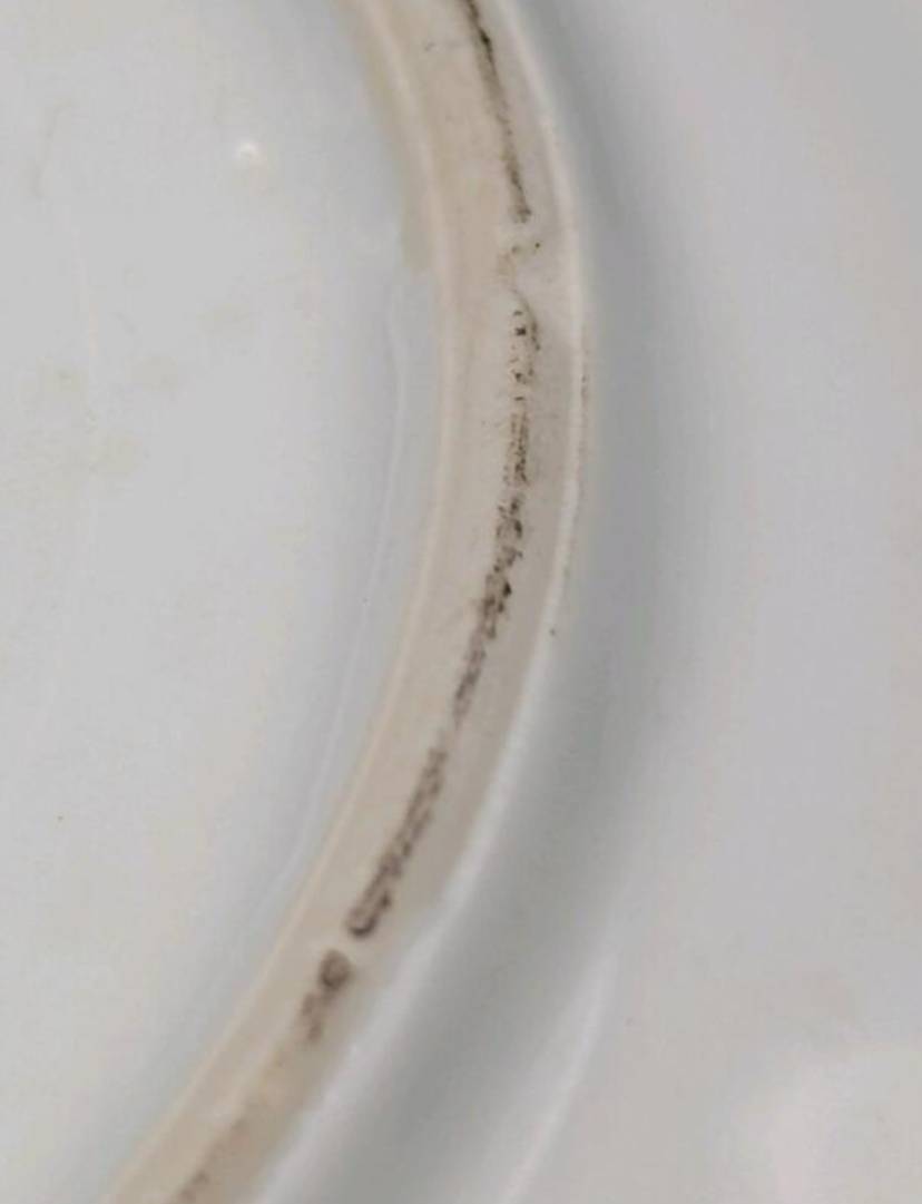 No Cracks, Small Chips in Bottom Rim of Saucer, Shallow Chips / Flaking to Feet, Scuffmark inside bowl, spot near top of room of saucer