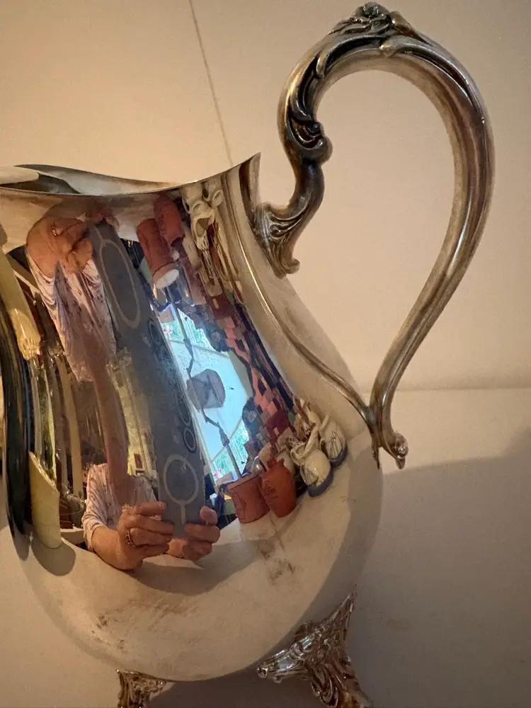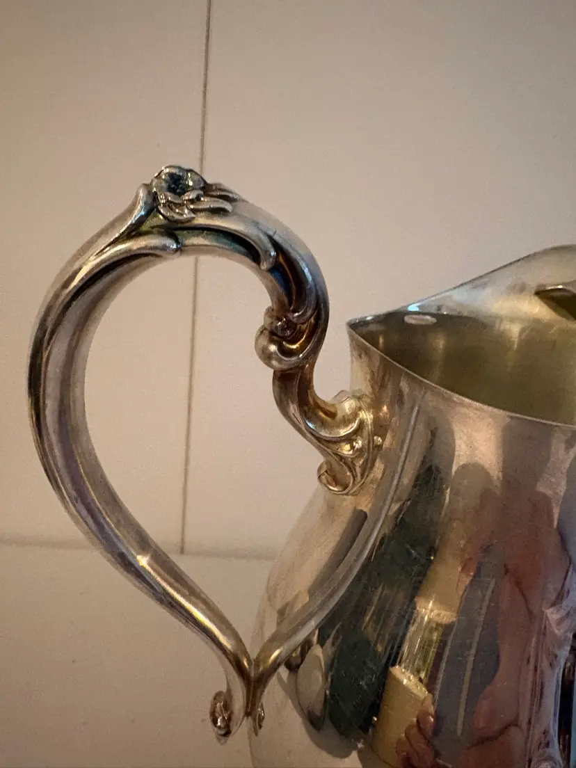The pitcher features a distinctive ice lip and is composed of high-quality silverplate, ensuring durability and a lasting shine. Perfect for those who appreciate the beauty and history of antique silverware, this item adds a touch of sophistication to serving drinks or displaying as a decorative piece