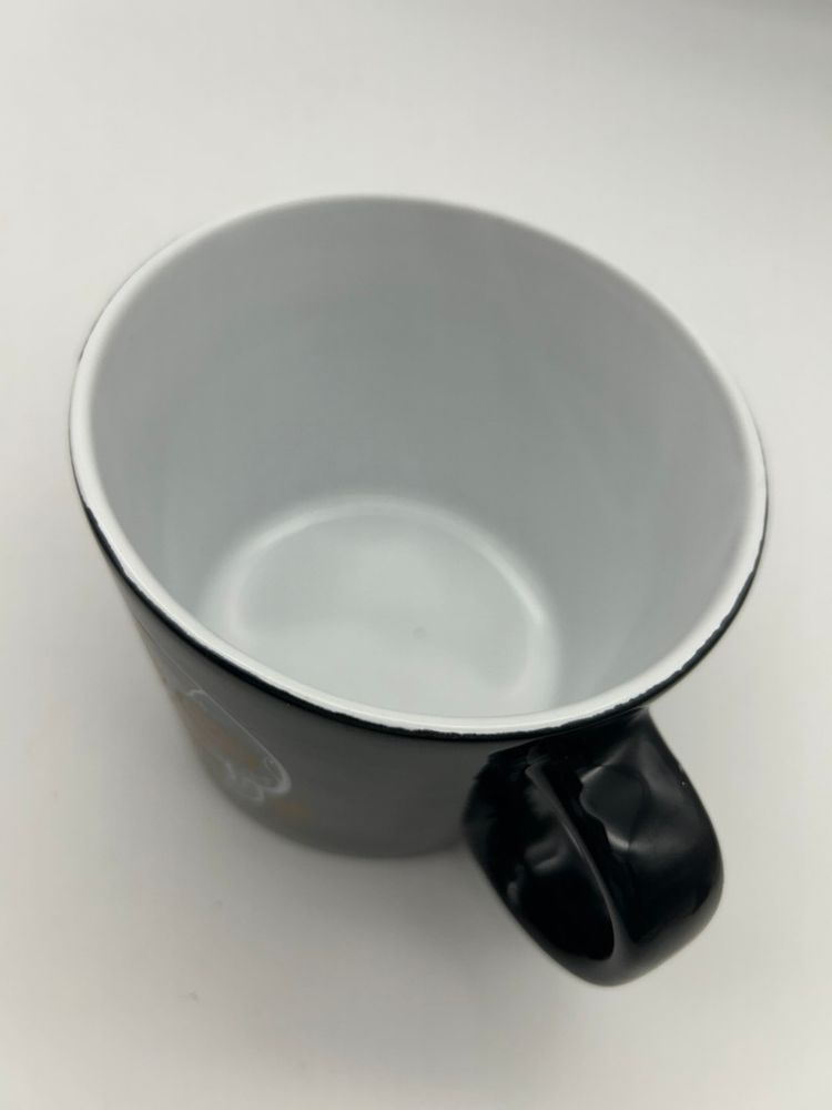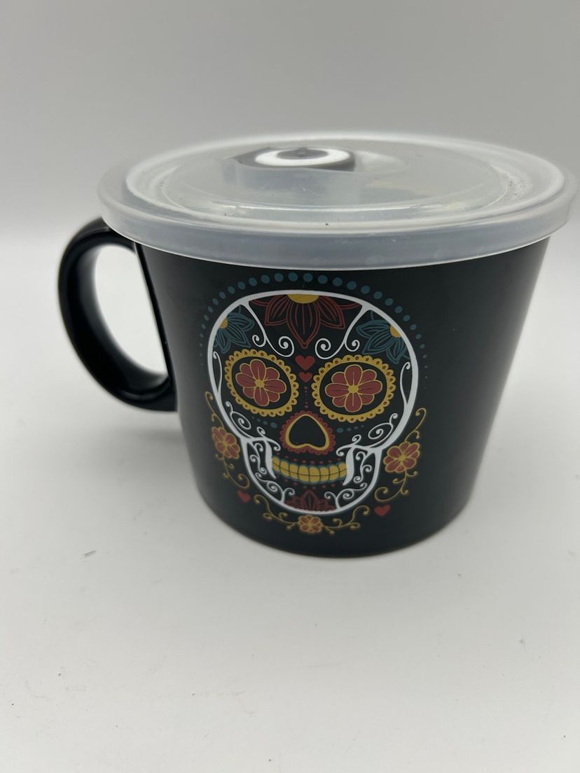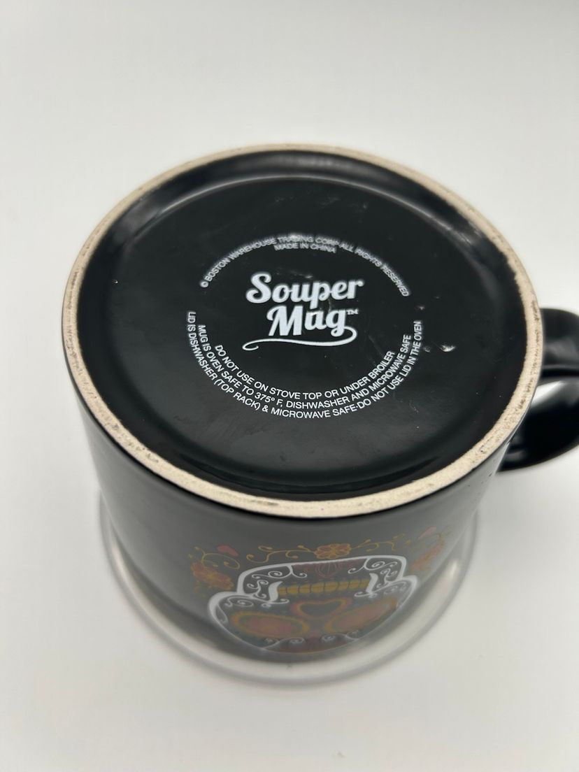 This black ceramic mug is made of ceramic and is microwave and dishwasher safe. It measures approximately 4” tall and 4 1/2” in diameter .