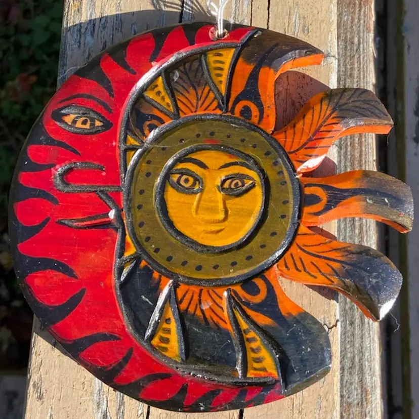 Approx: 7” x 7 x 5/8”d. Pre-owned condition. No cracks or dents. Hole and string for hanging. See images as part of description.