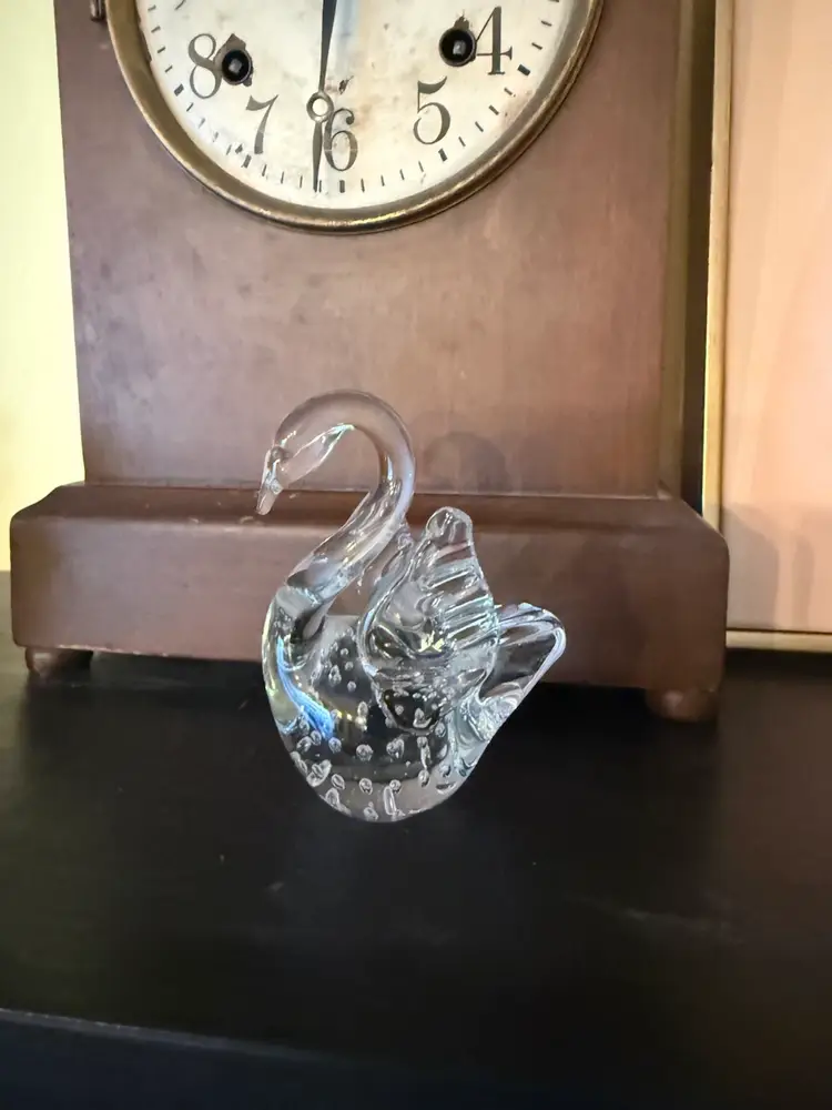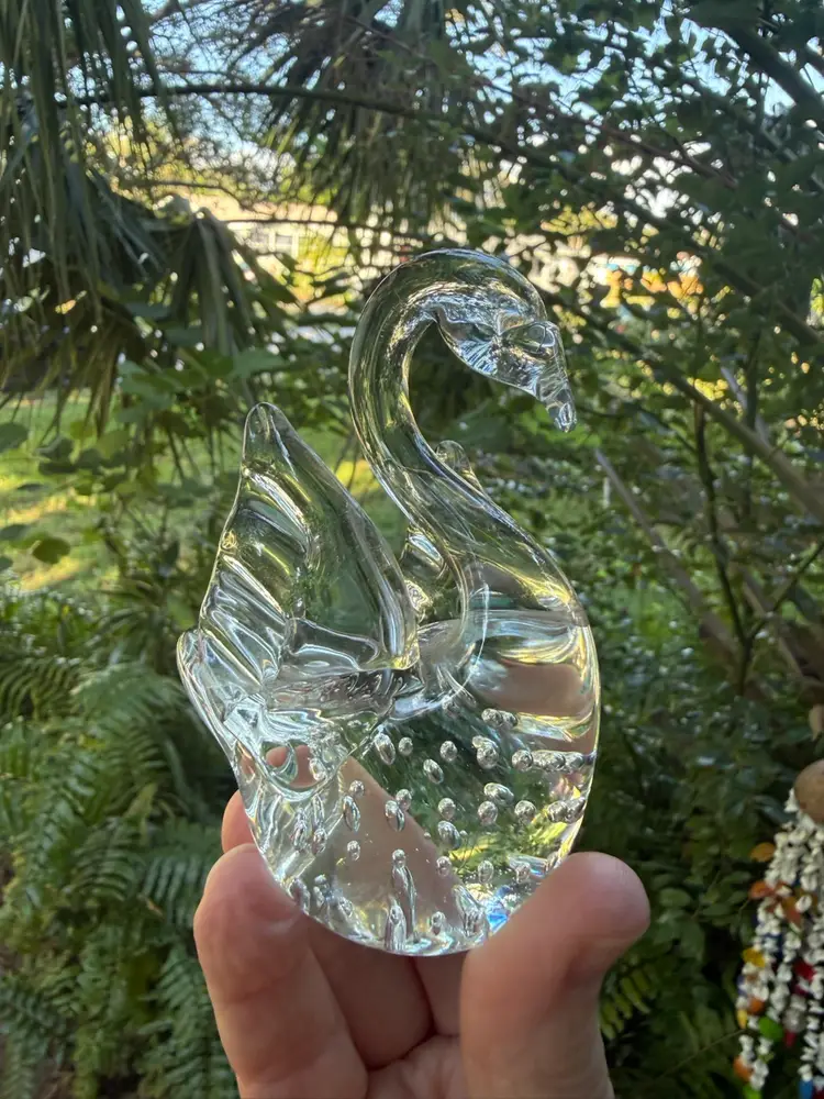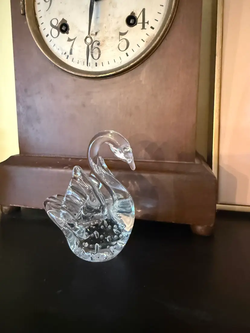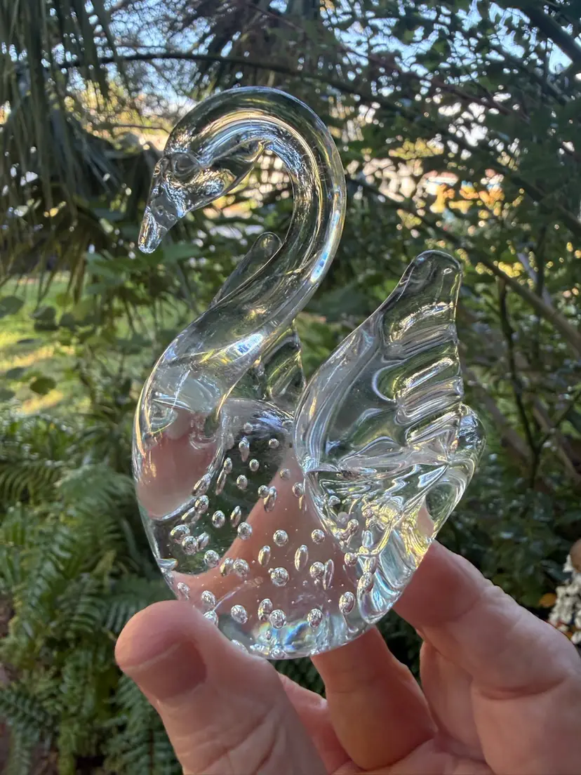This elegant vintage glass swan figurine shimmers with timeless beauty. Hand-blown in clear art glass with a stunning controlled bubble (Bullicante) design, this piece captures light beautifully from every angle. Its graceful curved neck and detailed wings make it a lovely display for any vintage or modern décor.