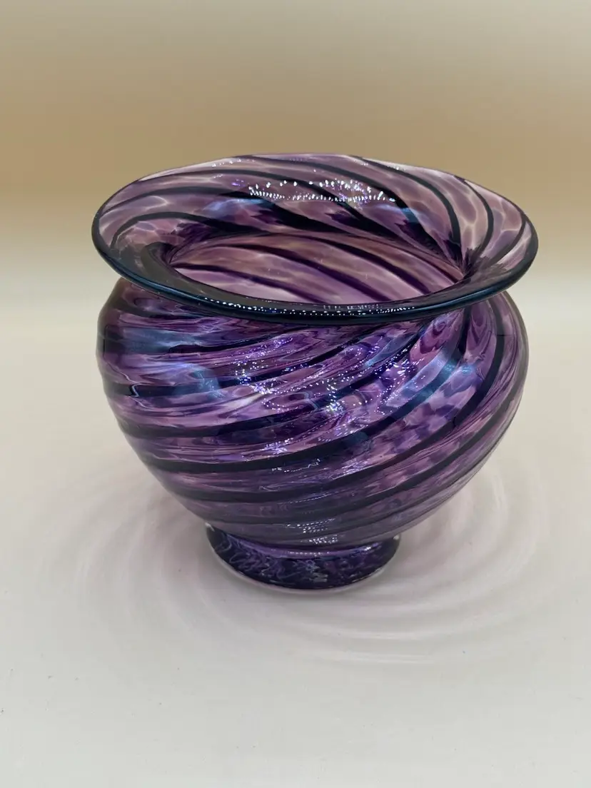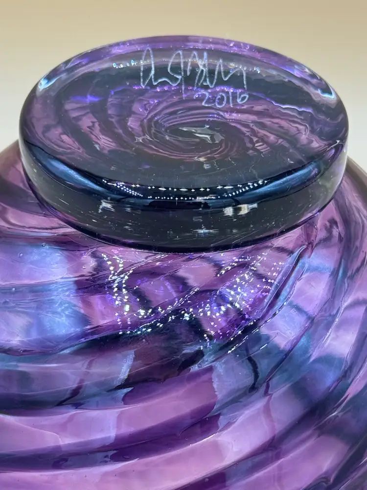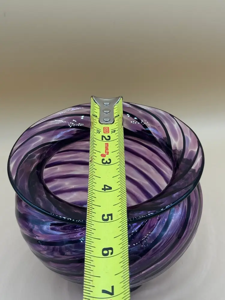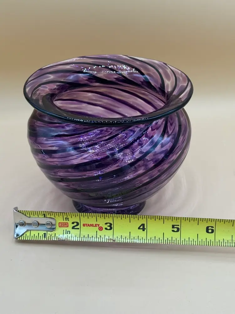 Beautiful art glass vase with purple and white swirled design. Nice pontil mark with signature and date on bottom. Measures 4.5” x 5”.