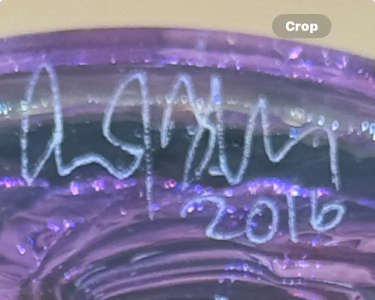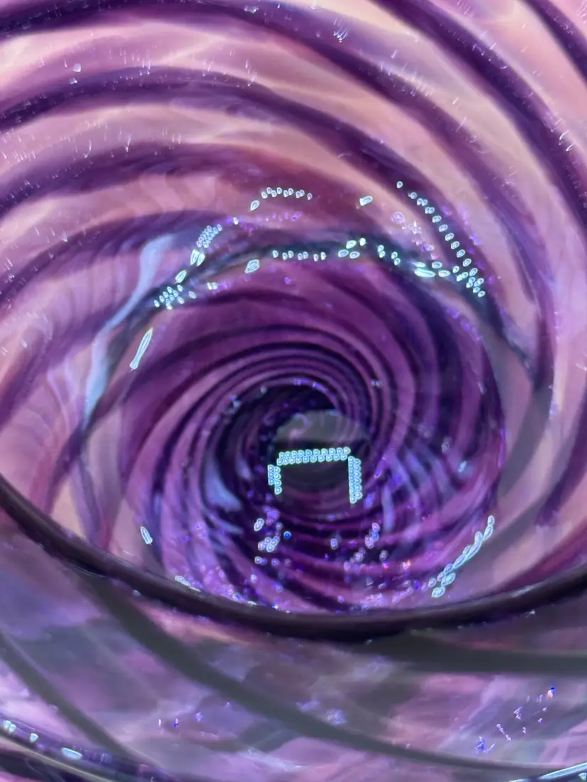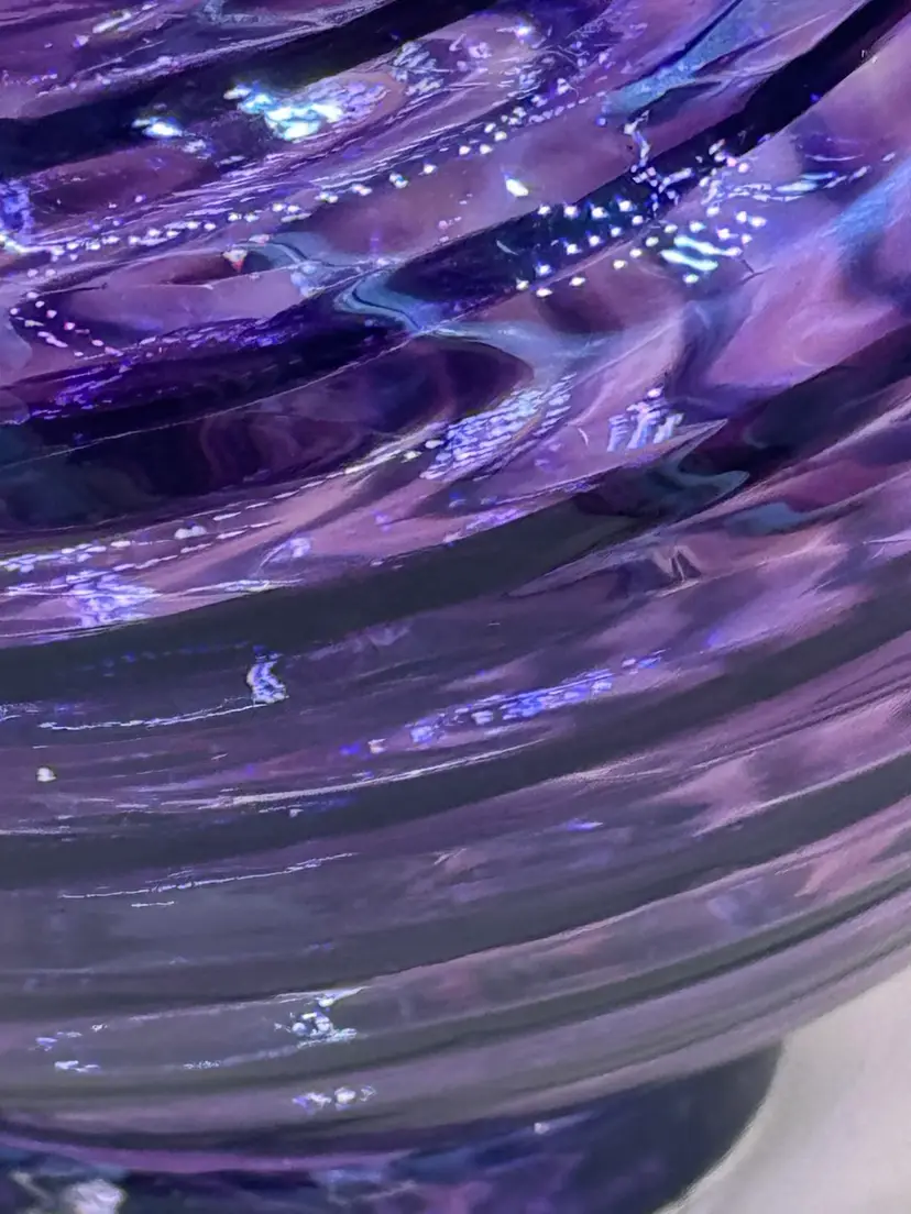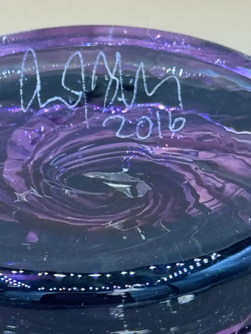 Beautiful art glass vase with purple and white swirled design. Nice pontil mark with signature and date on bottom. Measures 4.5” x 5”.