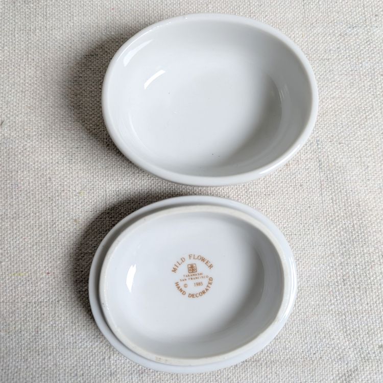 Cute Takahashi trinket dish in the mild flower pattern. Marked on the inside of the cover. "Mild Flower Takahashi San Francisco 1988" Has small chip on the bottom, which is pictured above, no other condition issues.