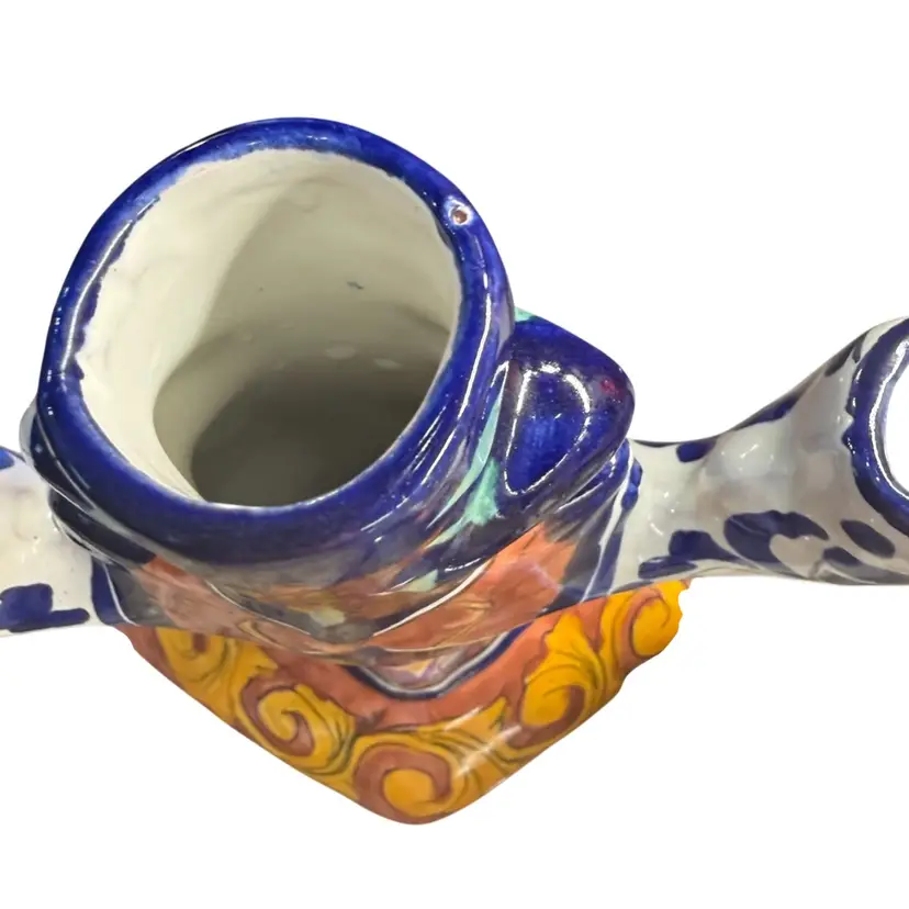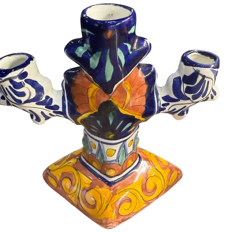 This beautiful Mexican folk art candle stick holds 3 candles. It is used bought at estate sale. In great shape no chips or cracks. I took a picture of a glaze pop on the top rim. It is smooth to touch so I believe it occurred during the firing.