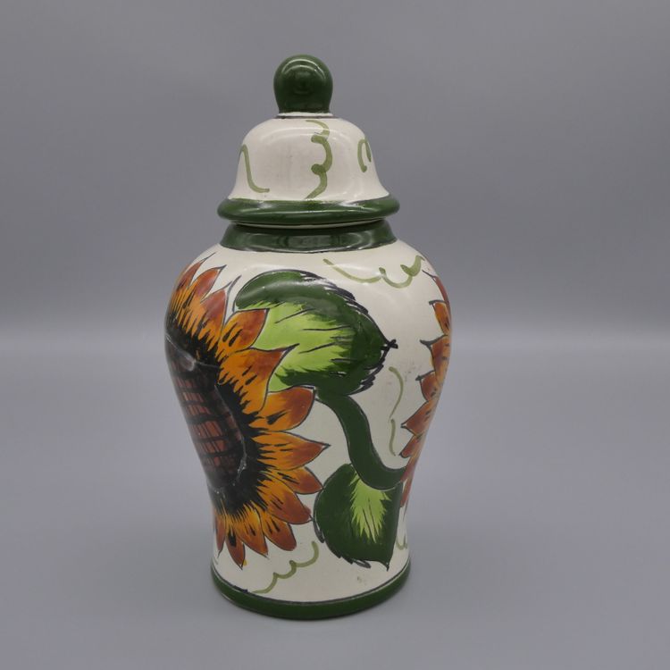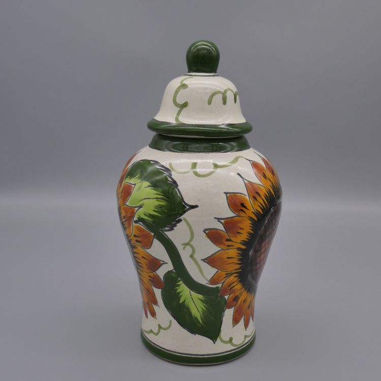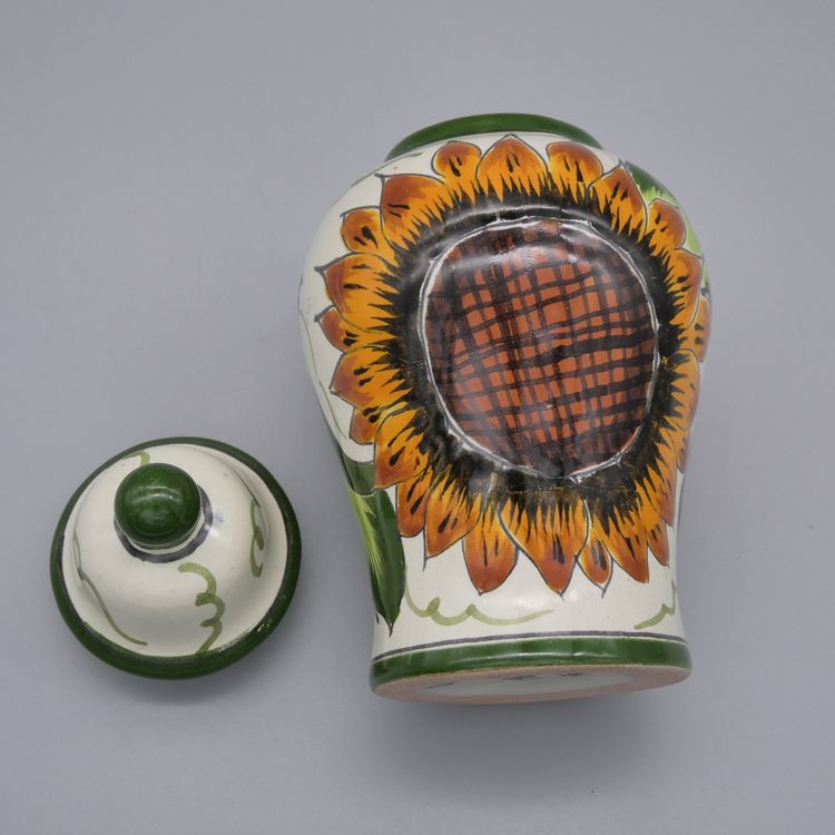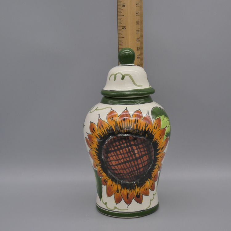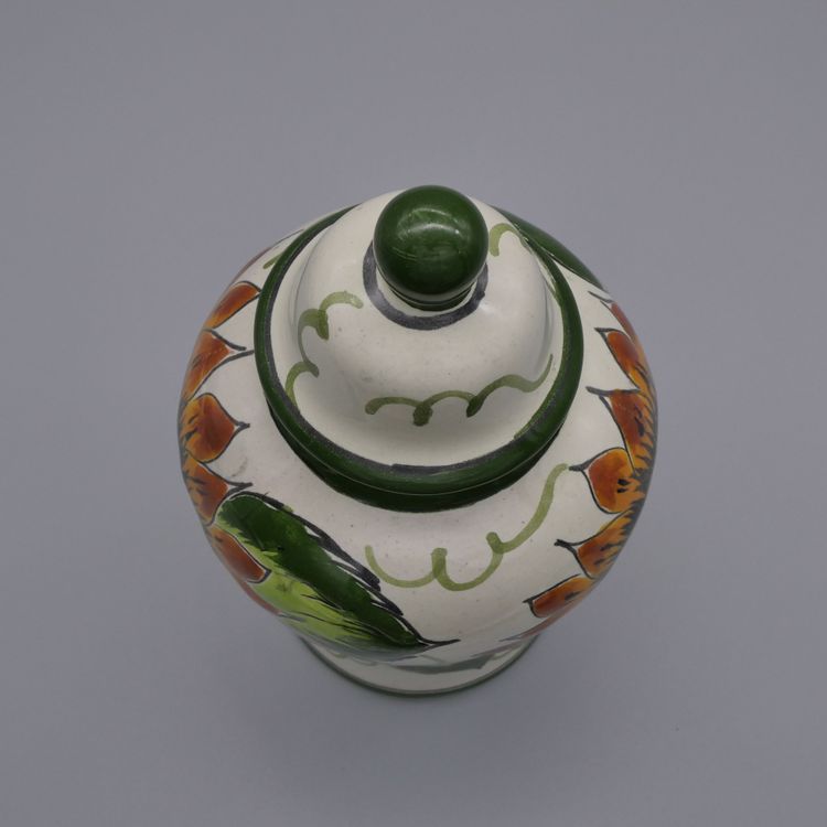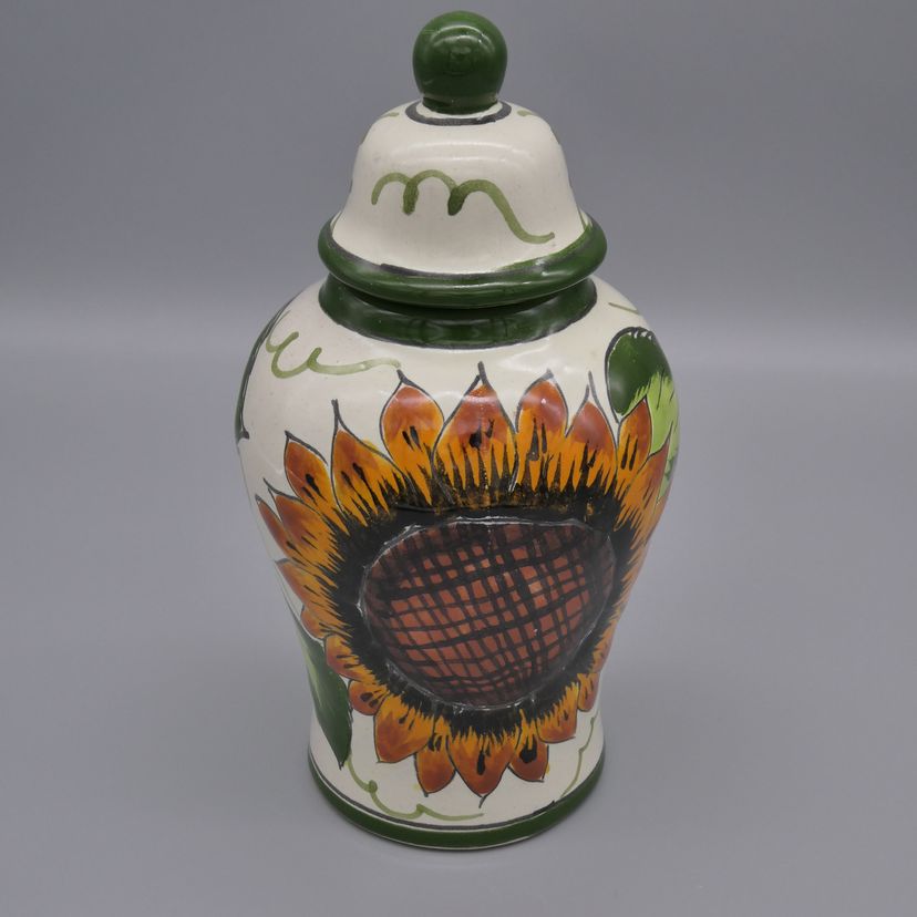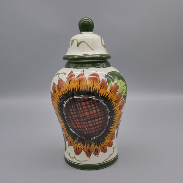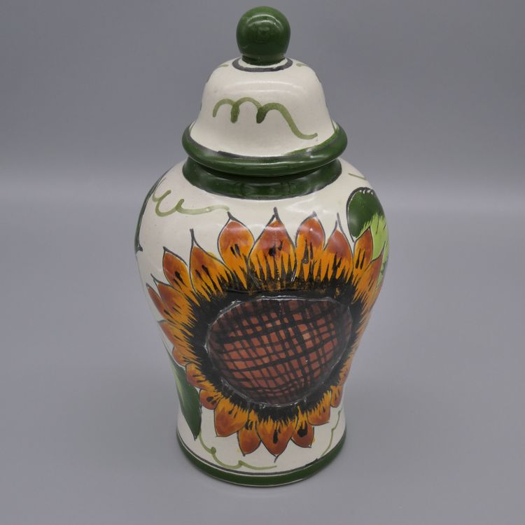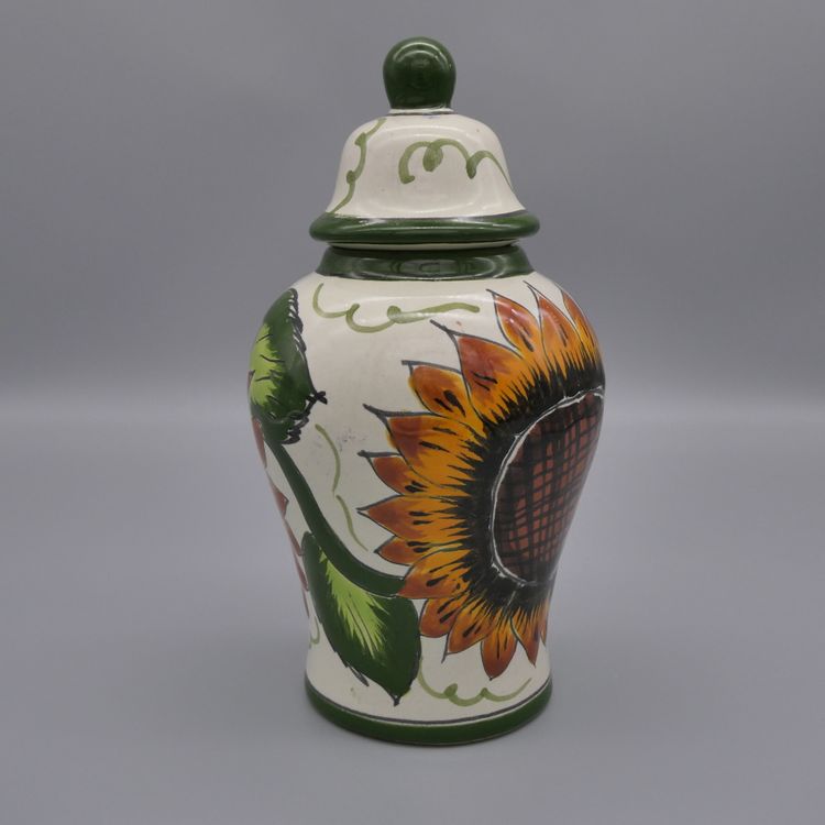 Featuring burnt orange sunflowers with vining greenery and squiggly accents Hand-crafted and painted folk art pottery ginger jar vase Design is double sided and fluid Subtle texturing on the flowers and leaves Can be used with or without the knobbed lid Marked on bottom: * Hecho En Mexico Measures overall about 7" tall including lid x 3-3/4" across at its widest point Weighs overall about 13 ounces before being packaged to ship