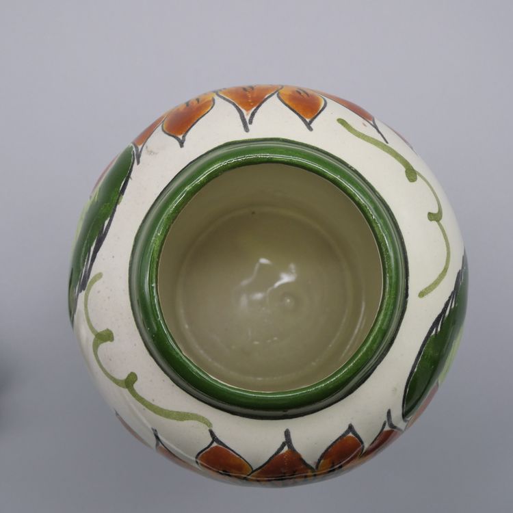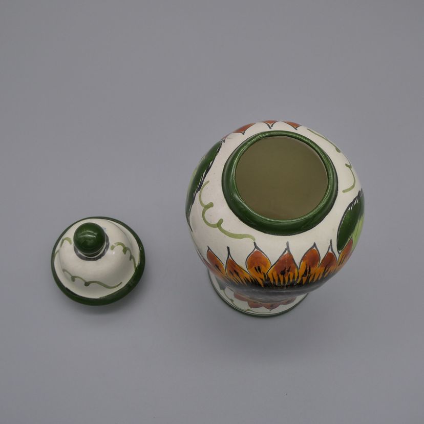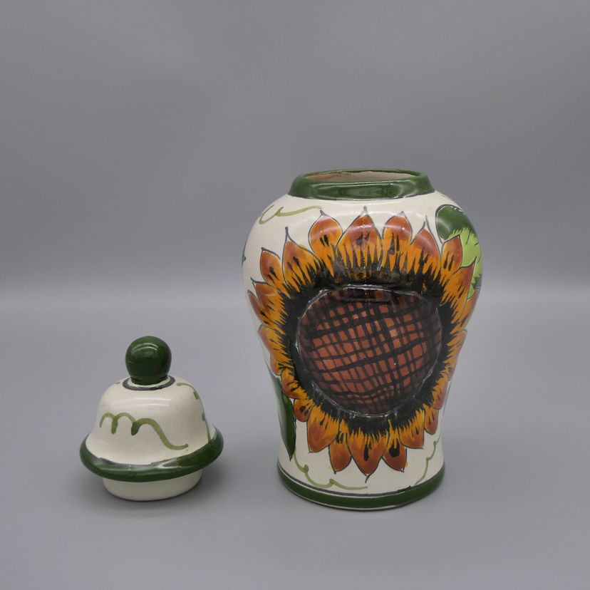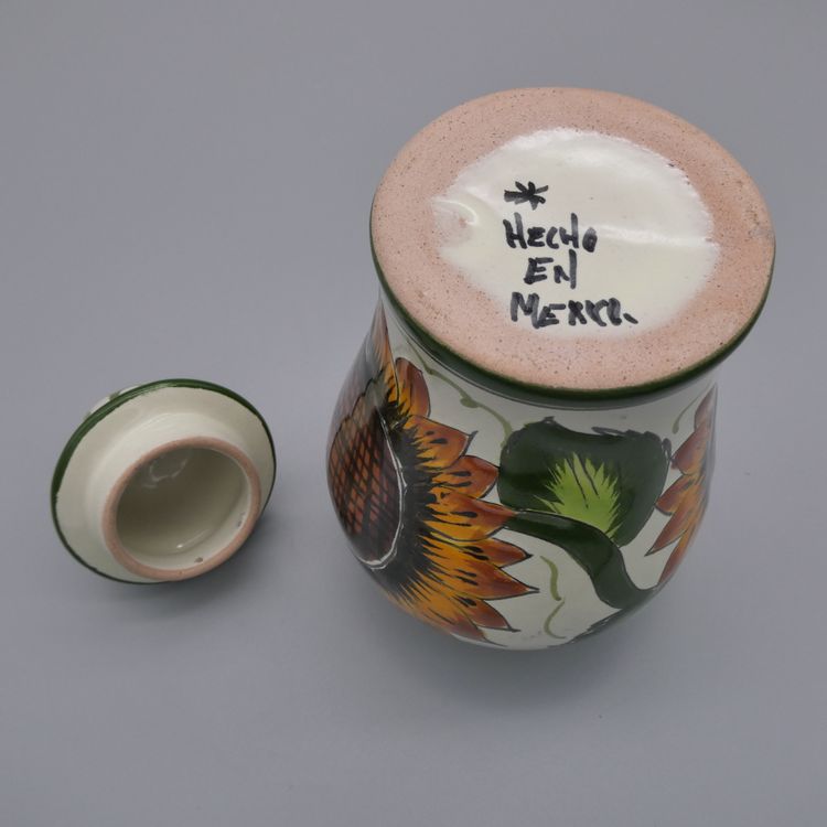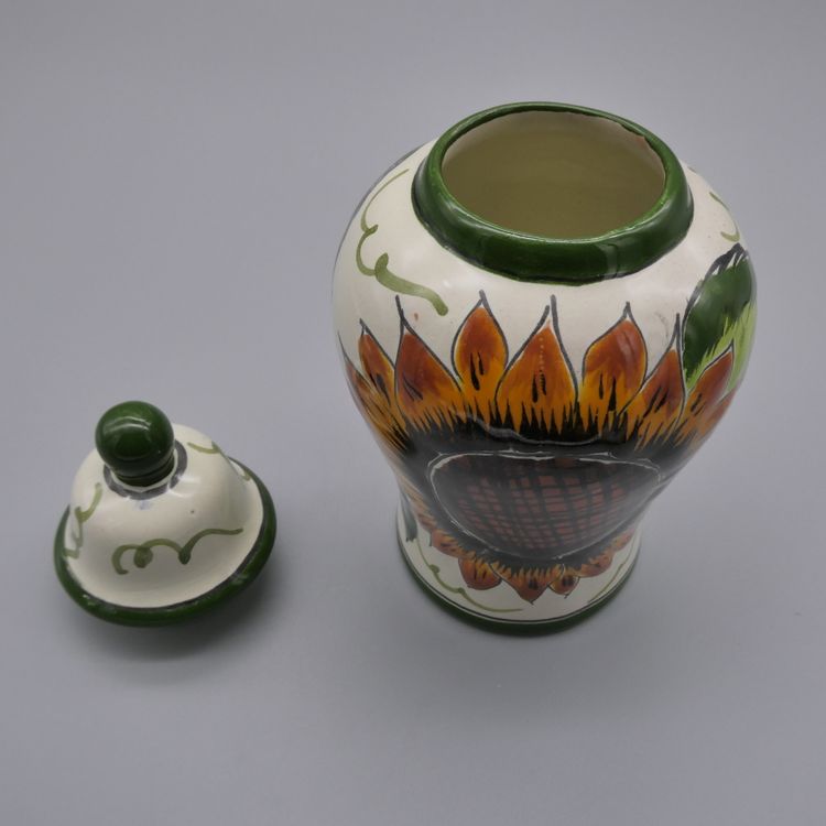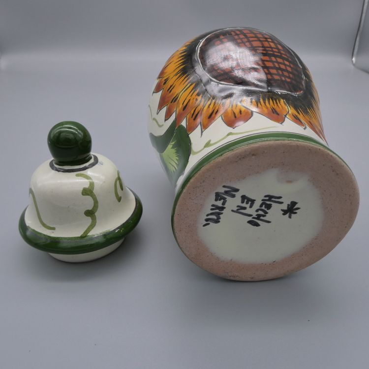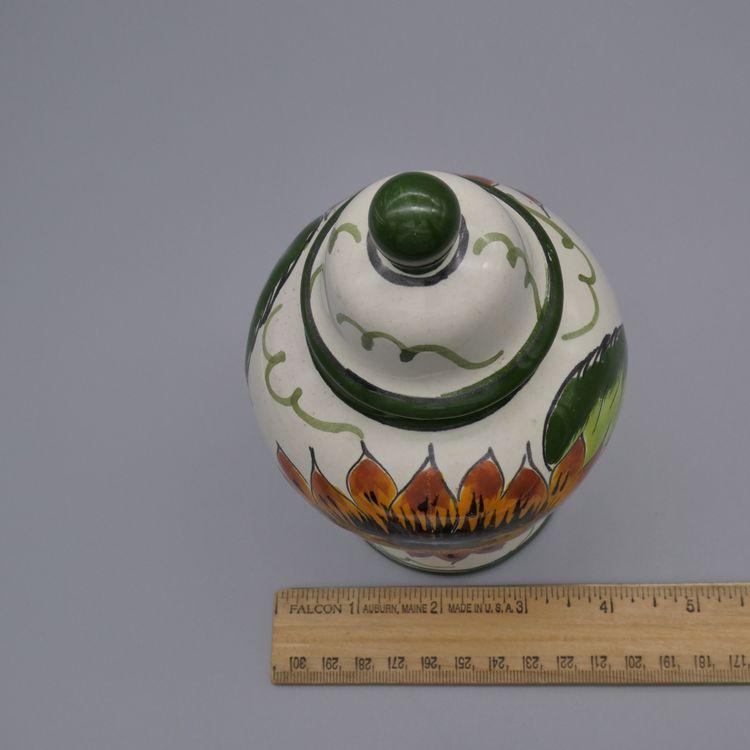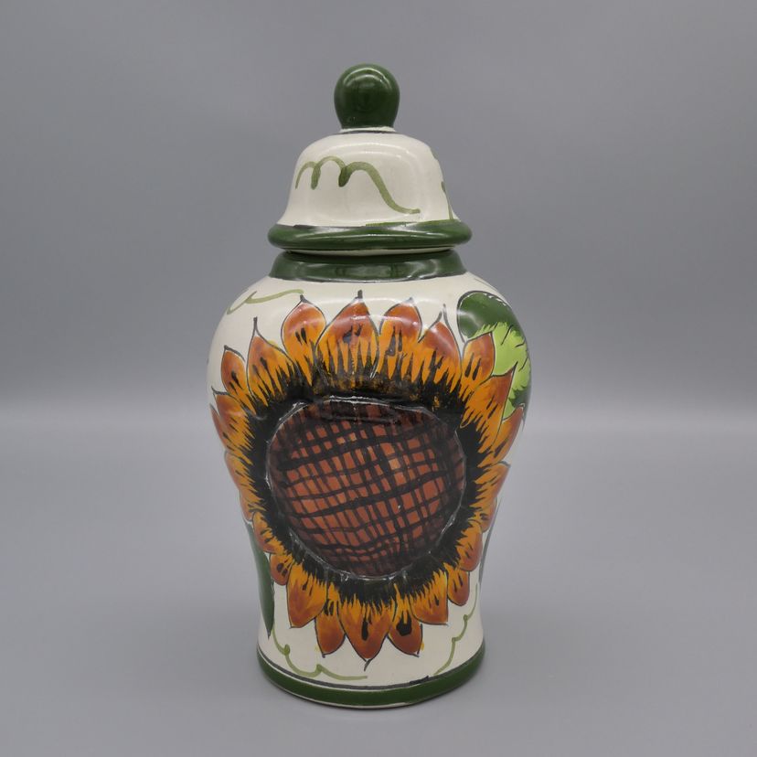 Featuring burnt orange sunflowers with vining greenery and squiggly accents Hand-crafted and painted folk art pottery ginger jar vase Design is double sided and fluid Subtle texturing on the flowers and leaves Can be used with or without the knobbed lid Marked on bottom: * Hecho En Mexico Measures overall about 7" tall including lid x 3-3/4" across at its widest point Weighs overall about 13 ounces before being packaged to ship
