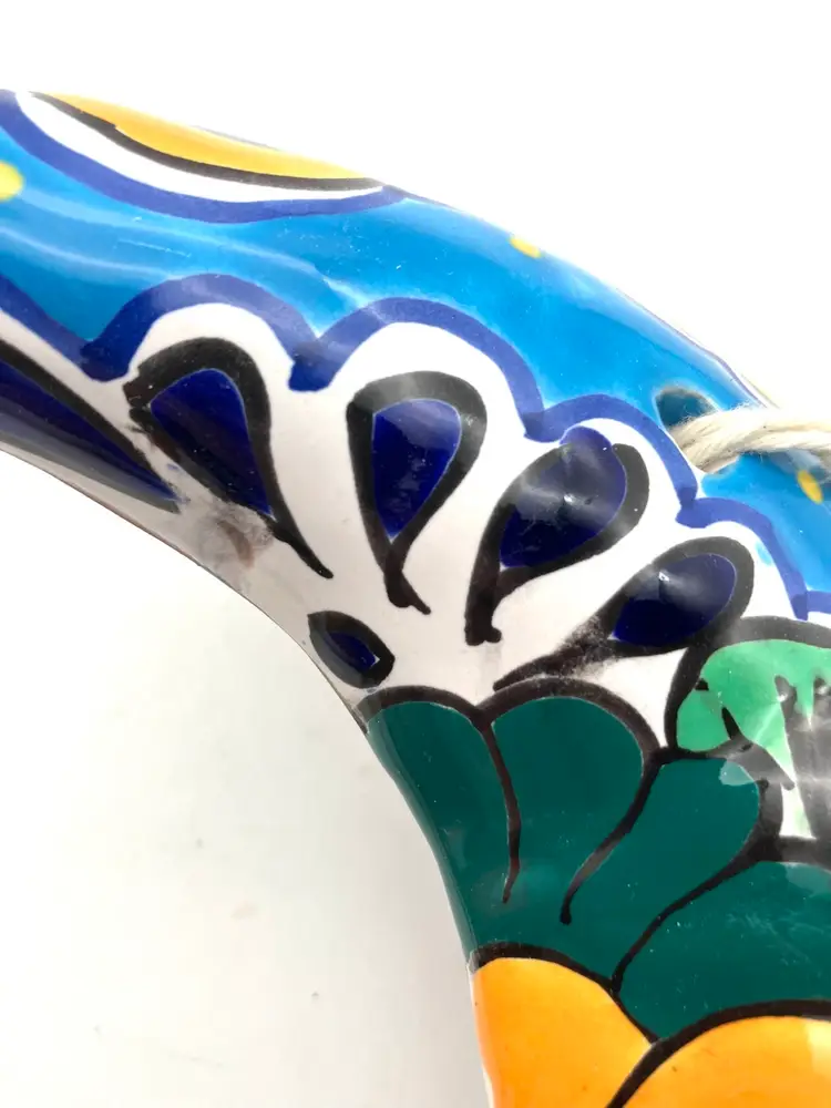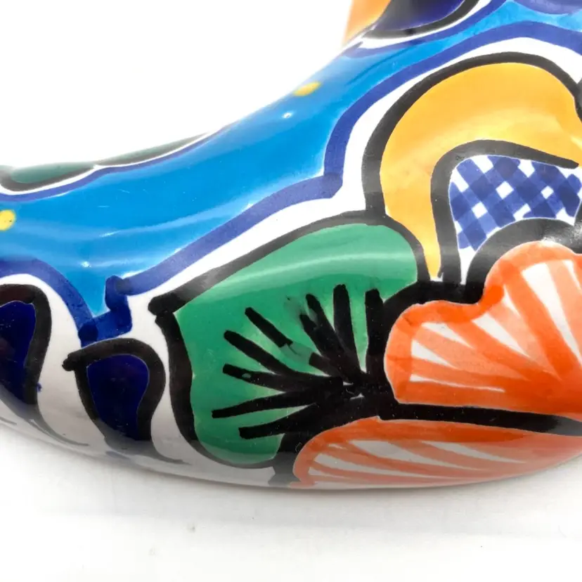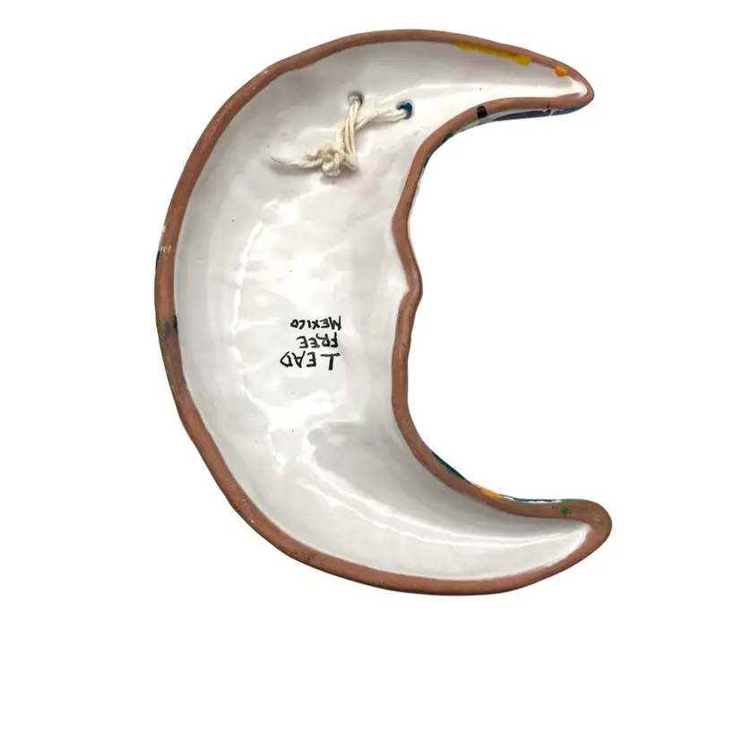 Colorful wall hanging crescent moon measuring 10 tall by 8 wide by 1.5” deep. Excellent condition but there are some manufacturing defects with glaze smudges. See pics.
