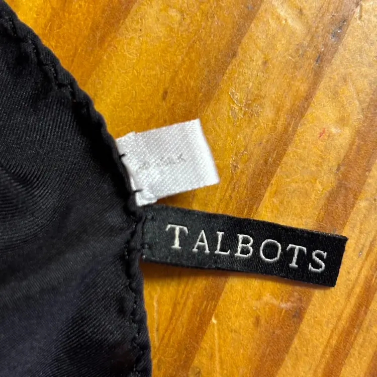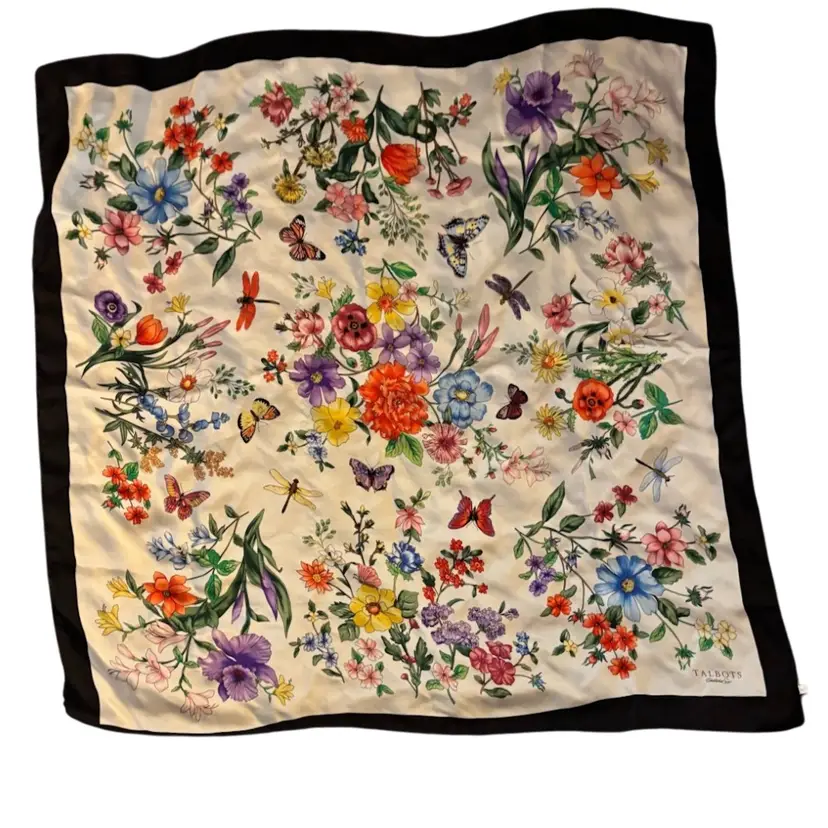 Approx. 34” squared Talbots 100% SILK scarf no tears or stains Freshly laundered! Smoke free home Would also make a beautiful table cover, lay on the back of a chair/couch or to just hang from a hook as decor!