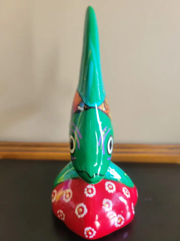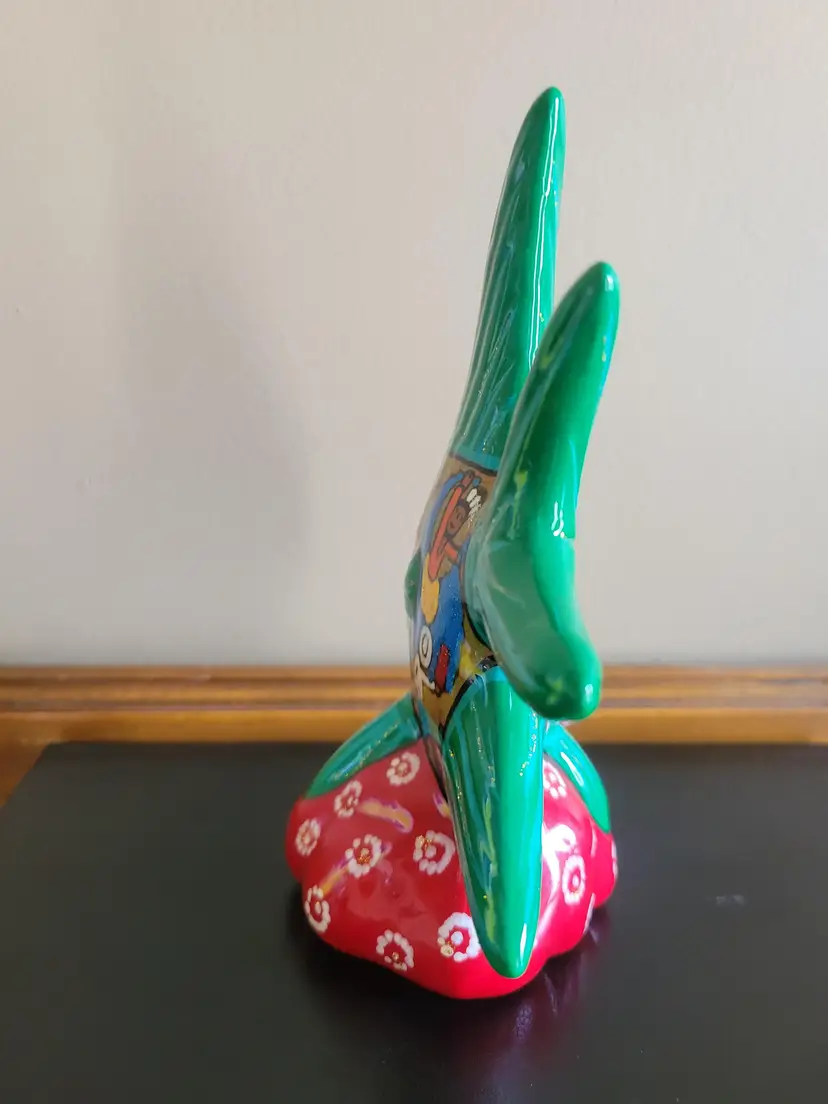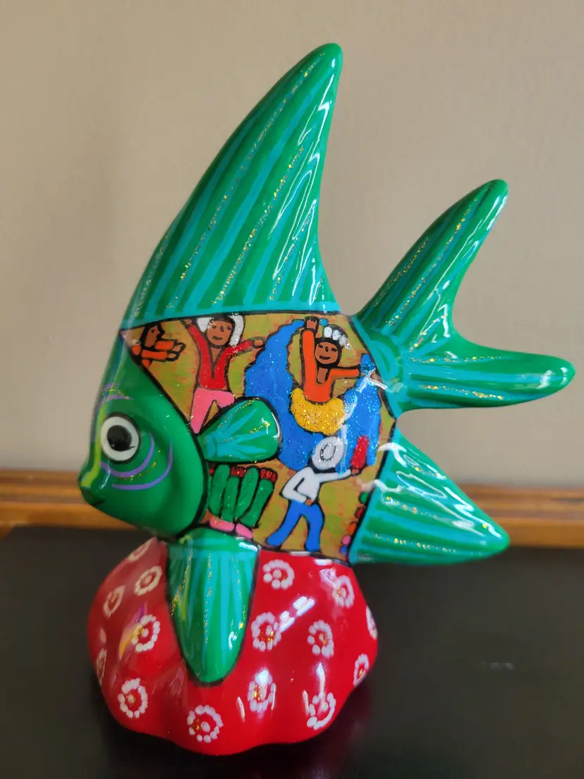 Beautiful Talevera Mexican Pottery fish with wedding scene. Measures 7 1/4 x 6"