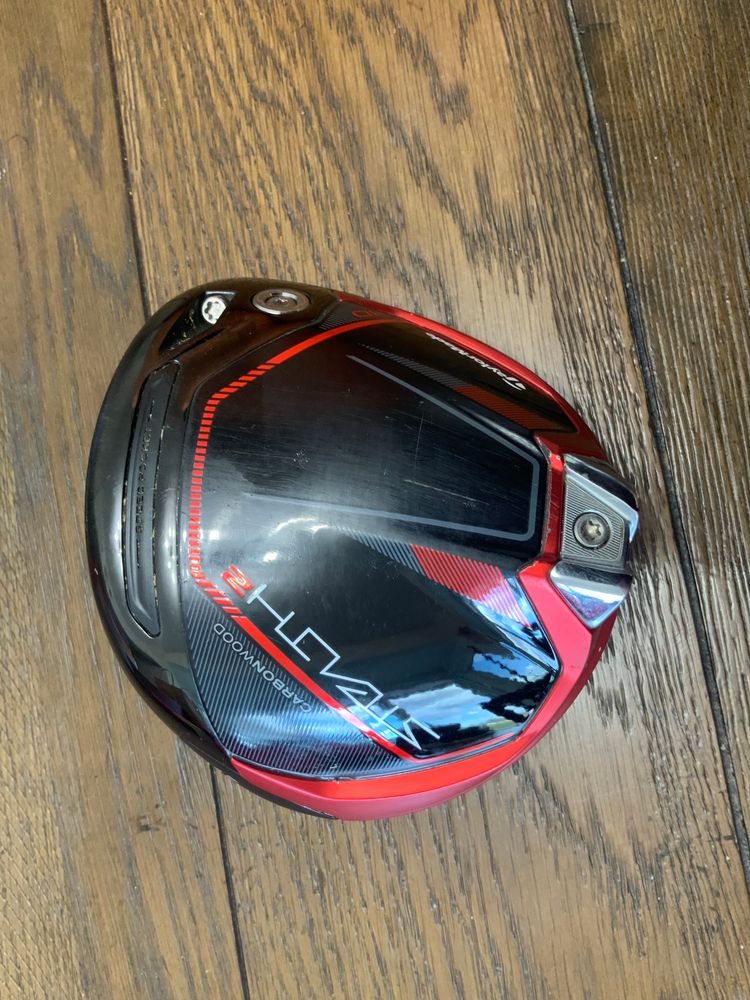 Taylor Made Stealth 2 driver head only and head cover. The head has a small ship on the back which has black epoxy fill and does not affect play.
