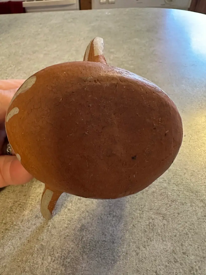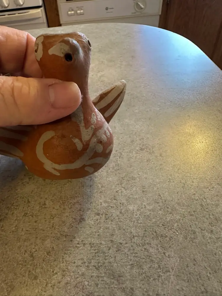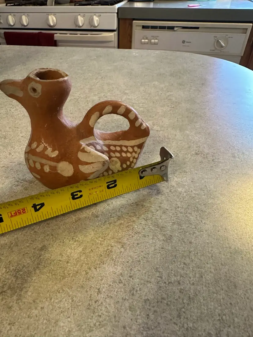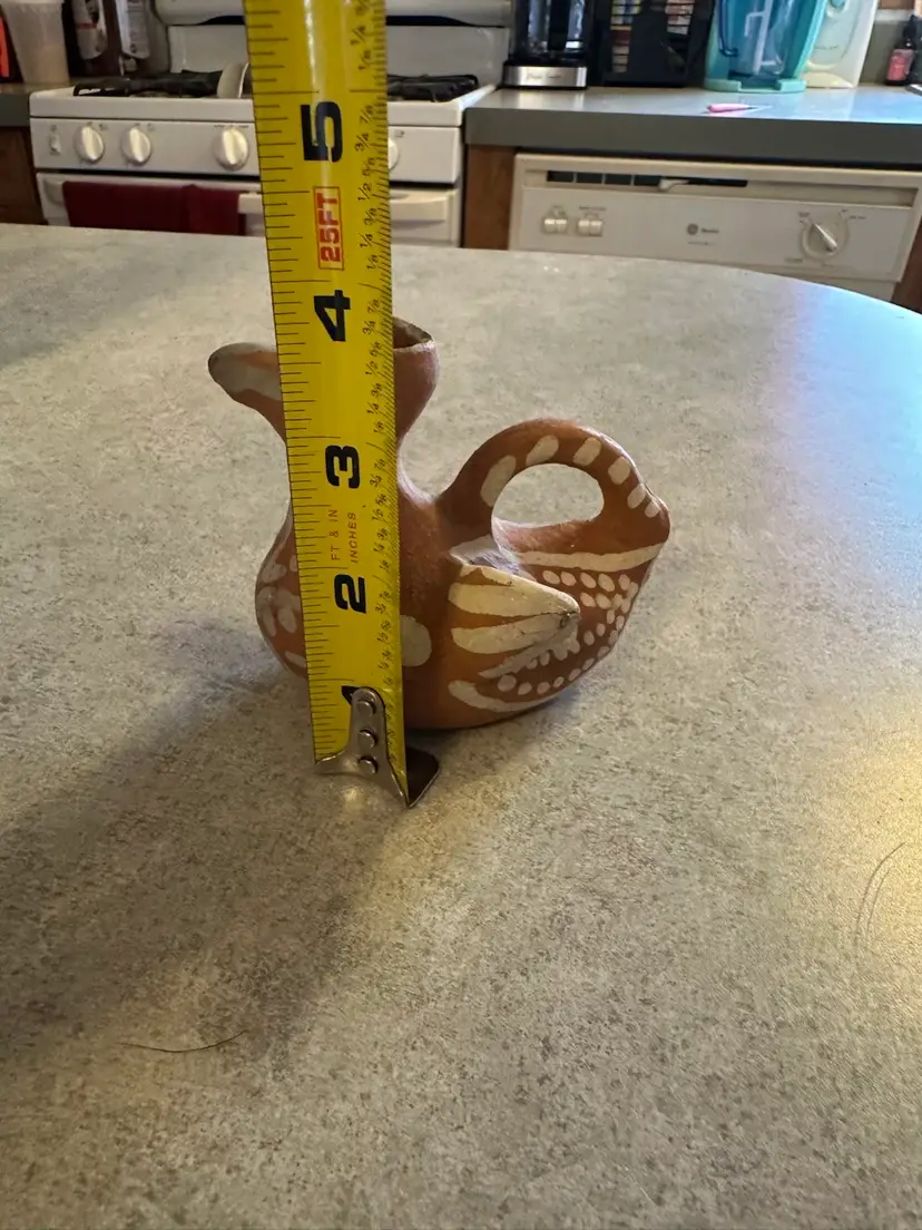 This terracotta bird-shaped pitcher is a traditional form of Mexican folk art pottery, likely from the Michoacán or Oaxaca region, dating to the mid-to-late 20th century. The distinctive reddish clay body with white slip decorations represents traditional indigenous pottery techniques that have been practiced for centuries in these regions. Rare.