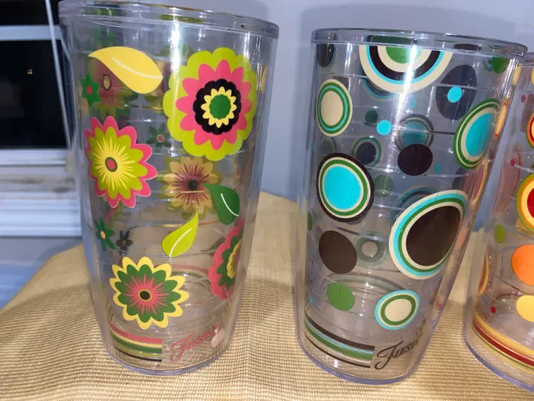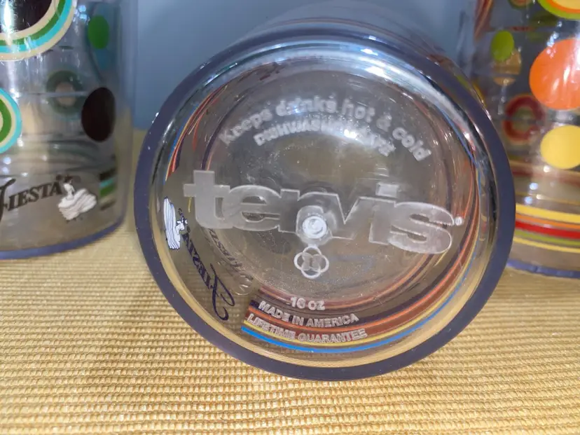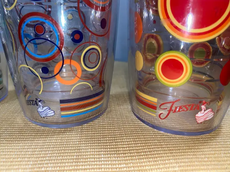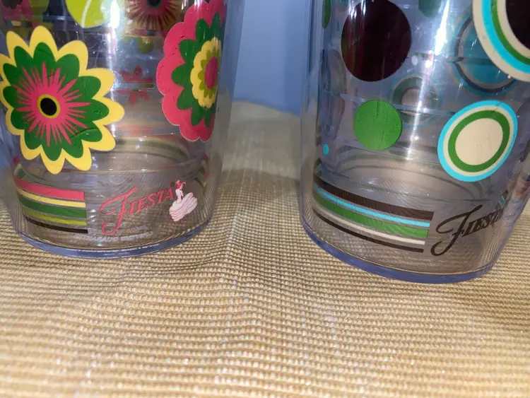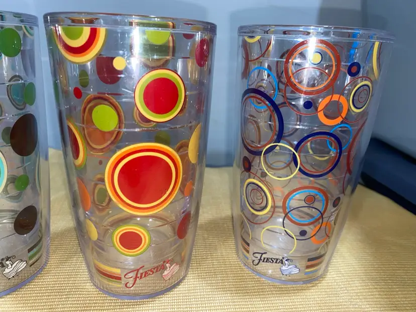 Set of 4 Tervis 16 oz Fiesta double walled insulated tumblers. Measure 6” tall 3 1/4” diameter at top. Nice condition