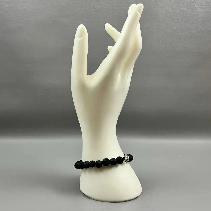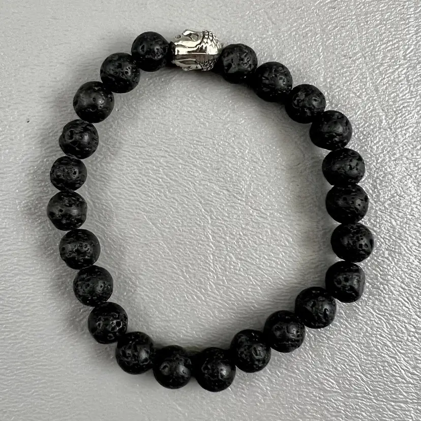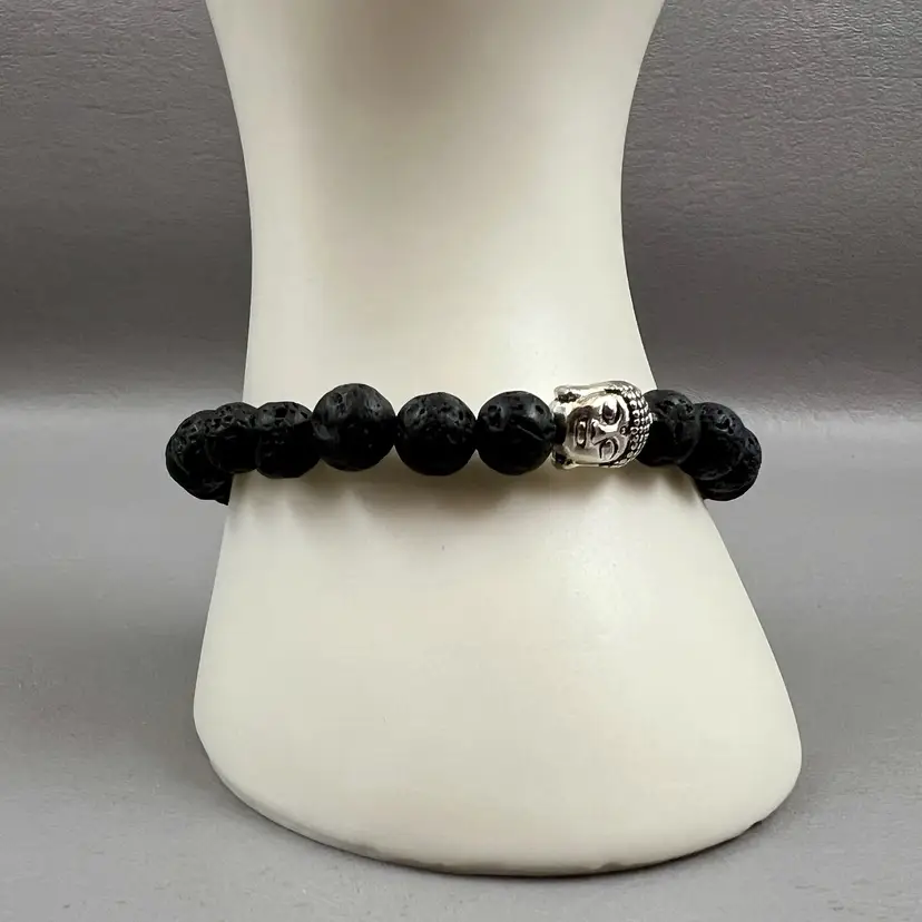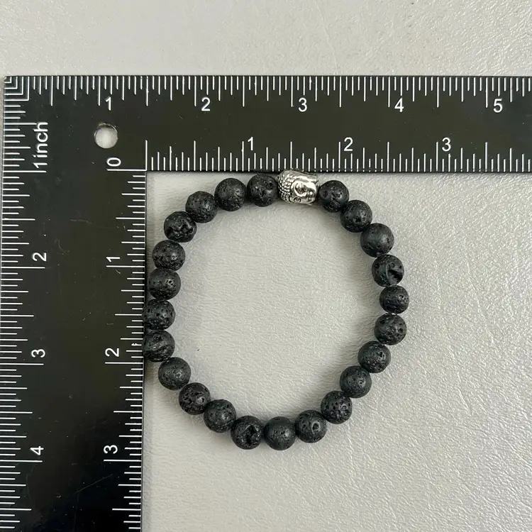 Textured Black Beaded Stretch Bracelet Silver Tone Buddha Head 3" Good Luck