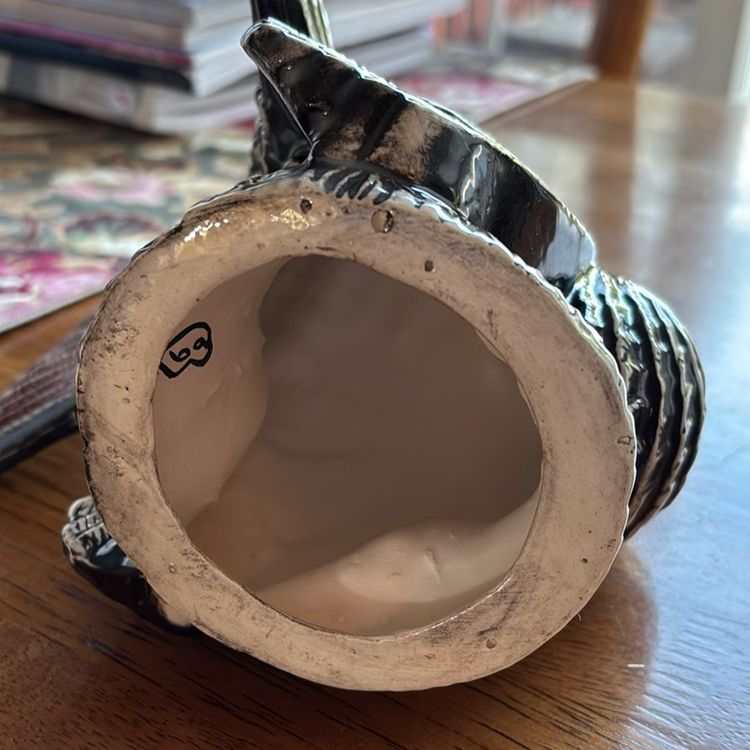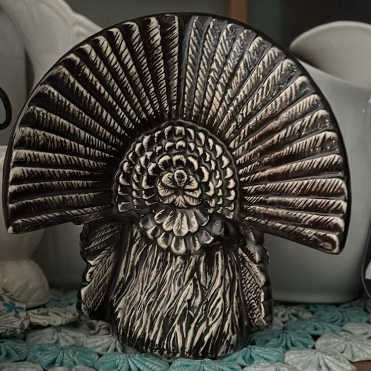 Unusual ivory and black washed ceramic Turkey! Perfect Thanksgiving piece with your Ironstone tableware. I believe this piece is a hobbiest piece and marked 1969. No flea bites or chips. Large size stands 7” tall by 6.5” wide.