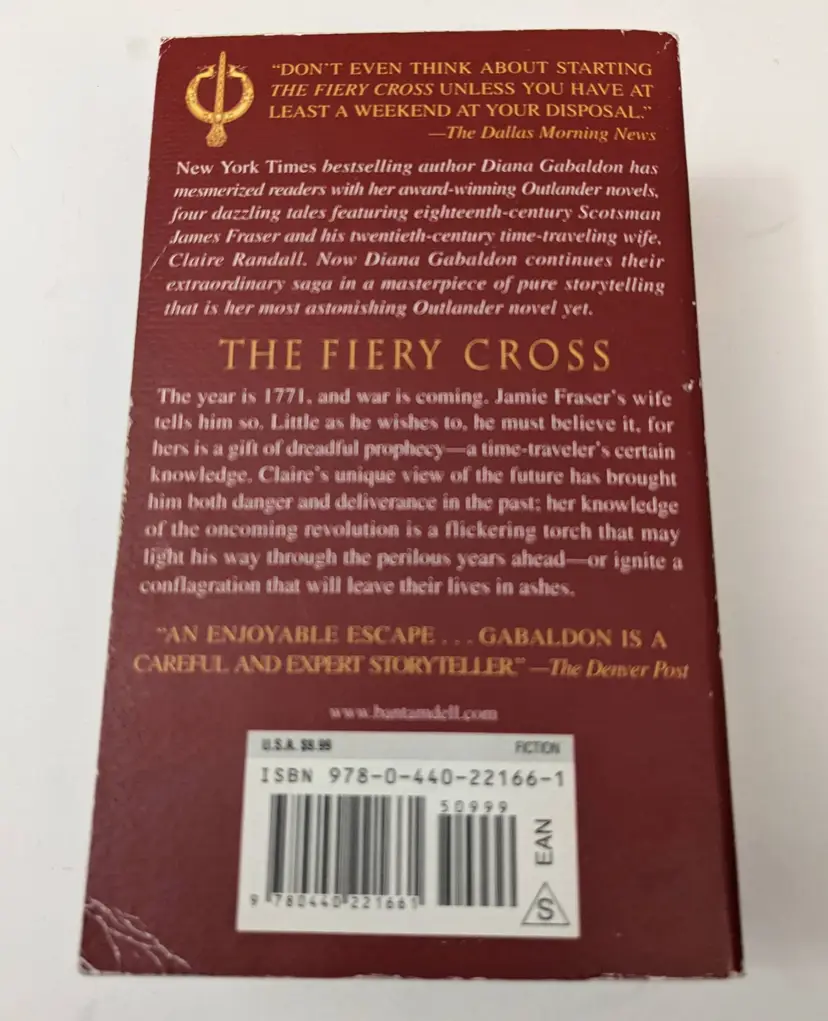 The Fiery Cross The year is 1771, and North Carolina is on the brink of revolution. Jamie Fraser stands between loyalty to his oath to the Crown and his knowledge—passed to him by his time-traveling wife, Claire—that war is coming. As tensions rise among the colonists, Jamie must unite the settlers under his leadership, even as he secretly prepares for the fight that will shape the future.