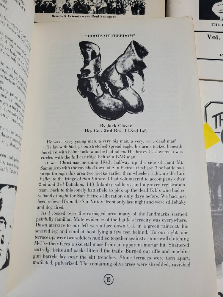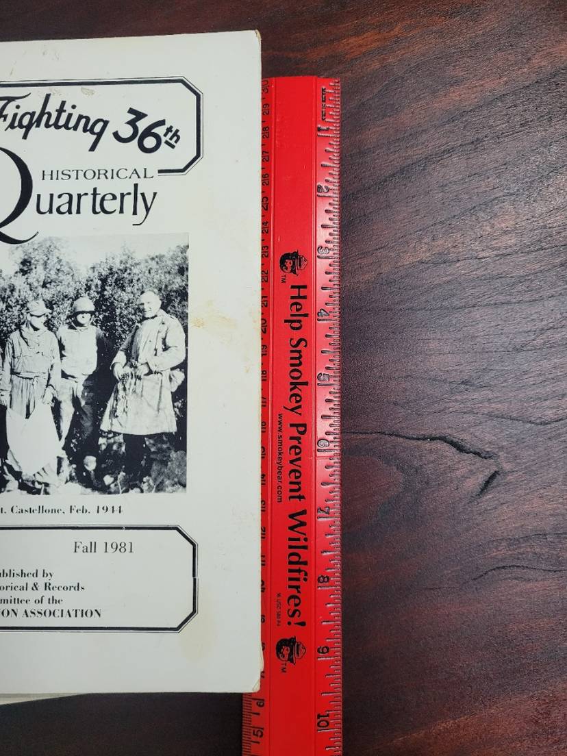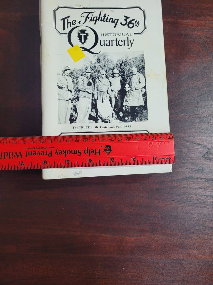 I have 7 Fighting 36th Historical Quarterly books that I am selling as a lot. The Fighting 36th is referring to and infantry division out of Texas from the Army National Guard in WWI and WWII particularly in the Italy. This collections includes the following volumes: Fall 1981 (The TRUCE at Mt. Castellone) Winter 1981 (Benito & Friends were Real Swingers) * Please note I am unable to SHOW the COVER of this one., Fall 1985 (The Lone Ranger Rides Again...) Summer 1986 (Unveiled for now--for the first time--) Fall 1986 ( Christmas Packages from home) Summer 1991 (Camp Blanding) Spring 1992 (Up for Seconds). ALL of these are in used condition. Most have a Price sticker on the front. Some have a folded corner. All could use a wide down as they appear to have been in storage for a while. BUT they are all tight in their binding. These are great resources with Stories from the men who fought in these wars. GREAT collection. There are Pictures inside every one (some of which would be "offensive" to some people (also why I did not show the one cover). Thanks for looking