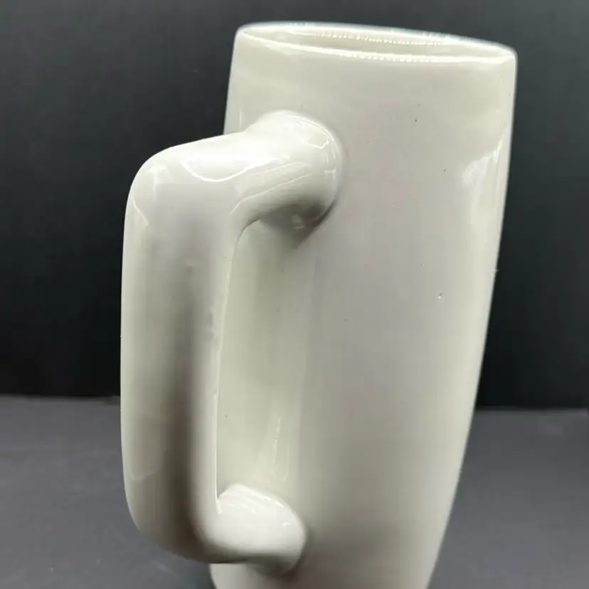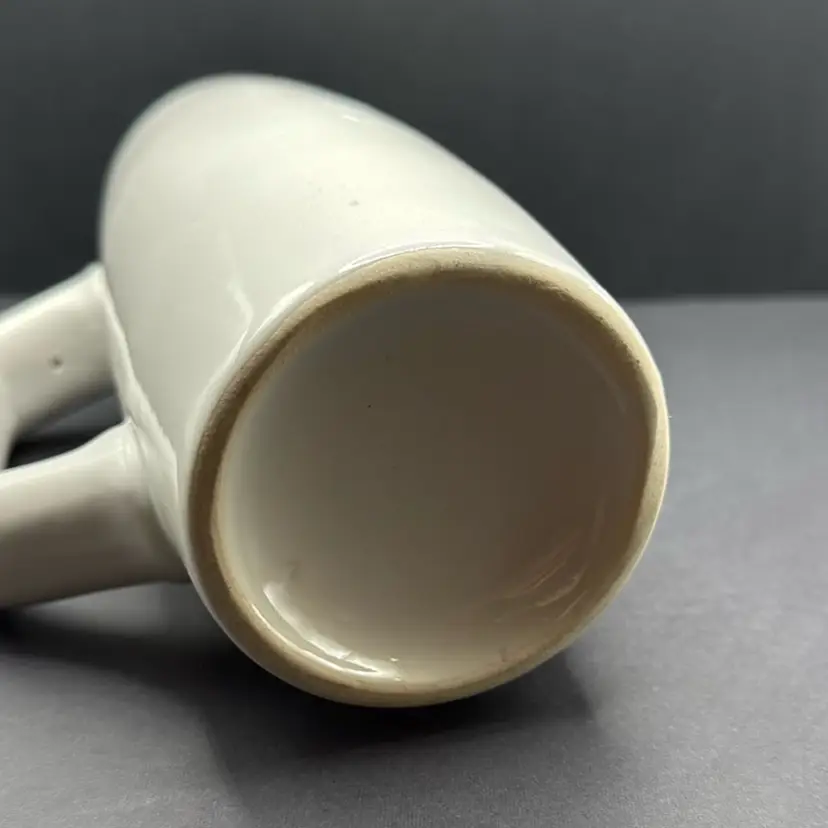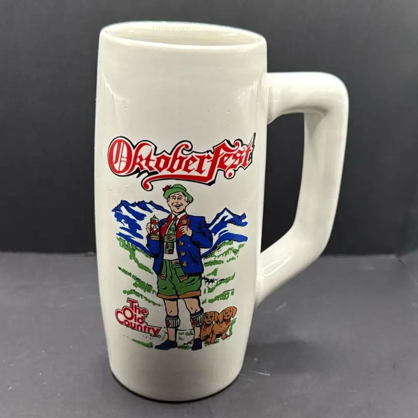 White mug with mountains, dip and German gentleman. No chips or cracks
