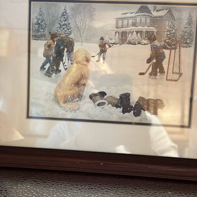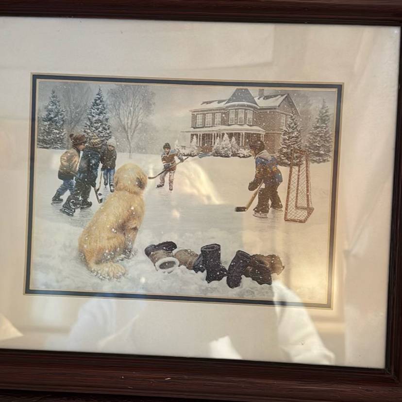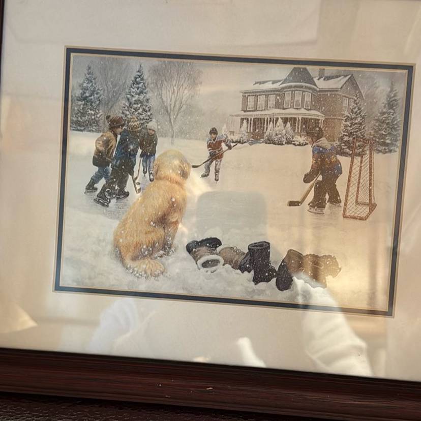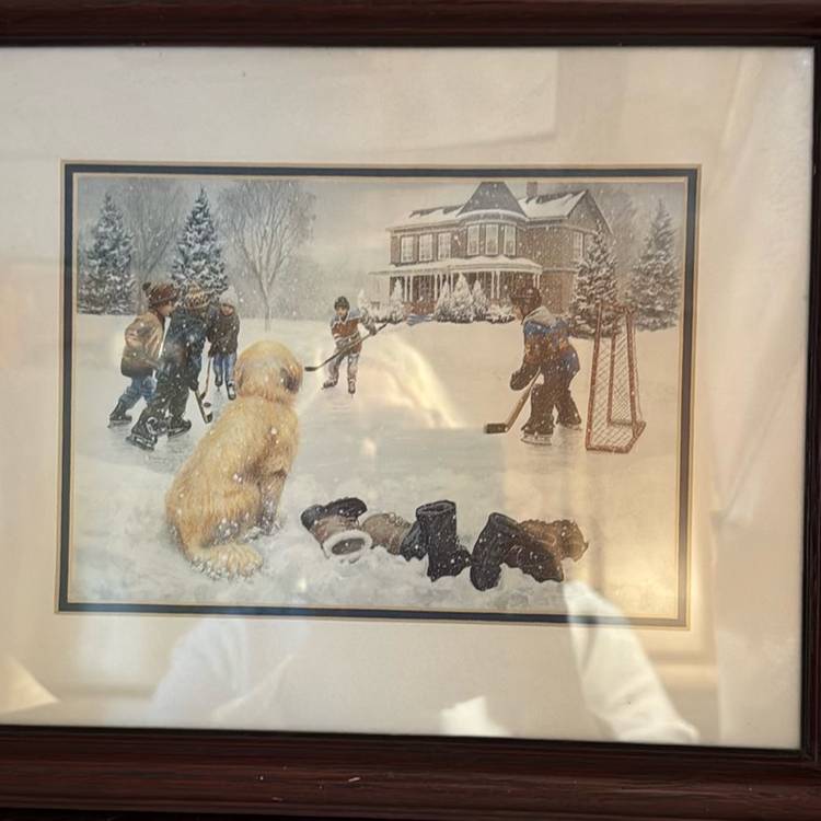 This is a well known print from Mary G Smith’s collection. It’s a beautiful winter scene playing Hockey with the dog watching.