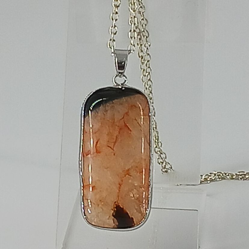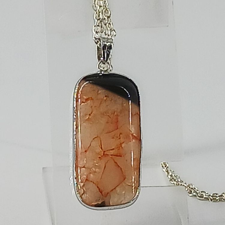 NM2346 – Orange and black Druzy Geode Agate gemstone that measures 1 1/2x3/4x1/4 inches is banded by Sterling Silver and hangs from a 20 inch silver plated chain.