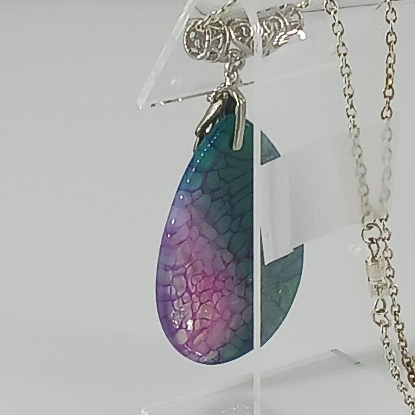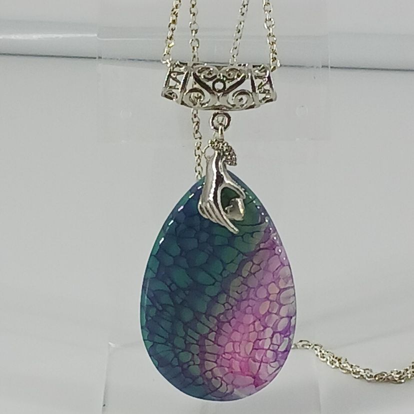 NM2345 – A Blue/Green and Purple Dragon Vein Agate gemstone that measures 2 1/8 x 1 3/8 x 3/16 inches hangs from a lovely silver plated hand bail which is suspended from a 20 inch silver plated chain with screw closure.