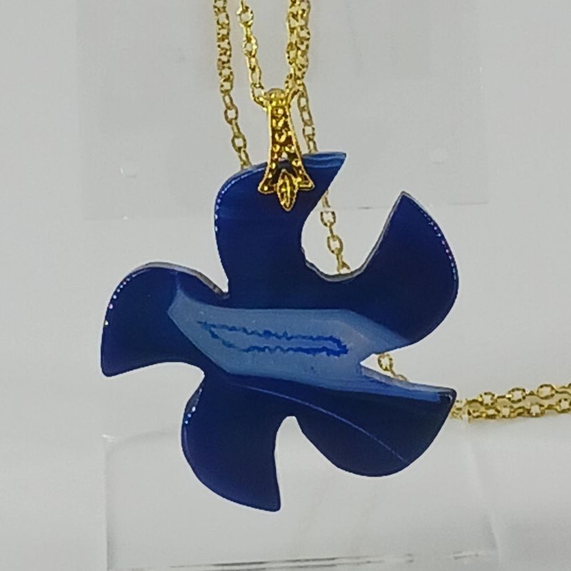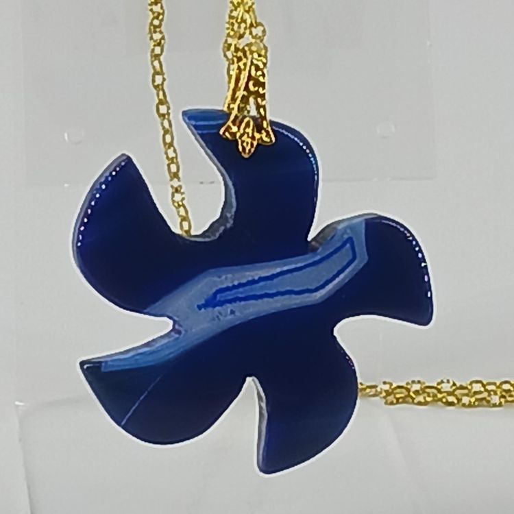 NM2347 – A Blue Druzy Geode Agate gemstone shaped as a flower and measures1 3/4x1/4inch and is suspended from a gold plated 20 inch chain.