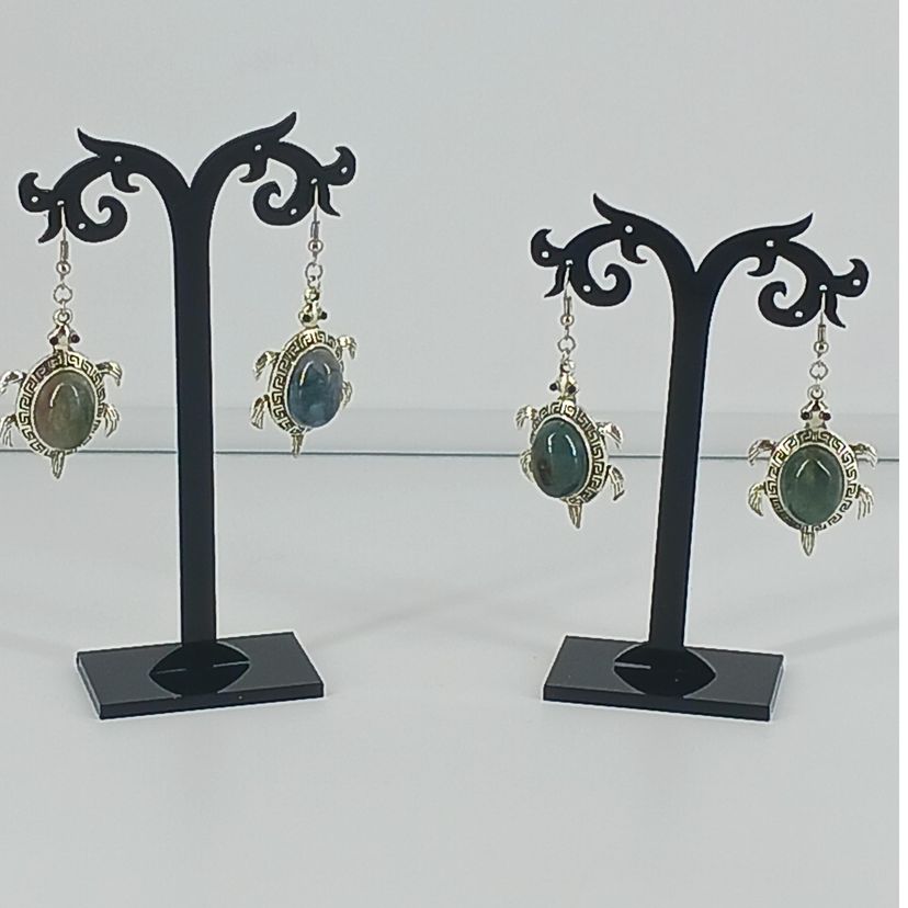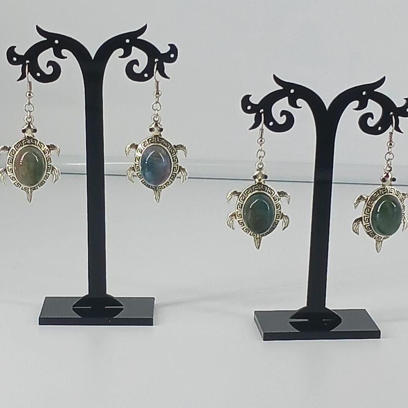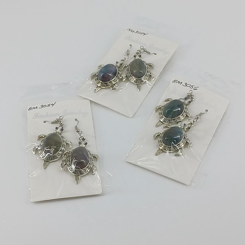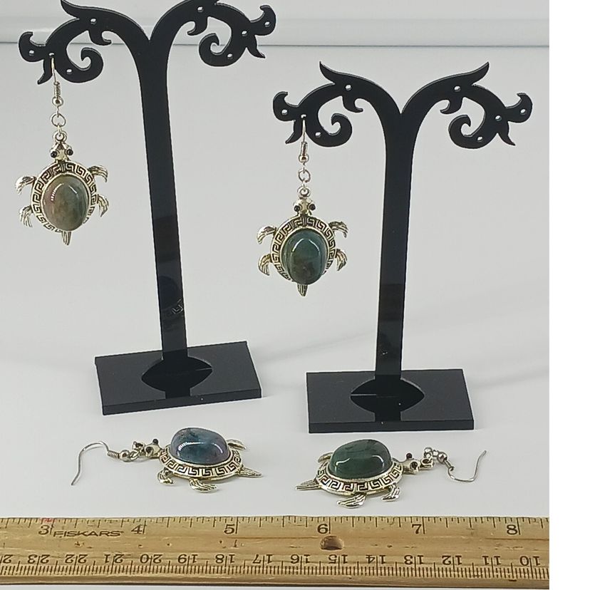 Qty 2 - EM3056 – Moss Agate cabochon gemstone that measures 3/4x9/16x1/4 inch has been mounted into a Tibetan Silver open backed cabochon setting in the shape of a Turtle that measures 1 5/8x1 1/8 inch and has two black glass eye beads and is suspended from a stainless steel earring wire.