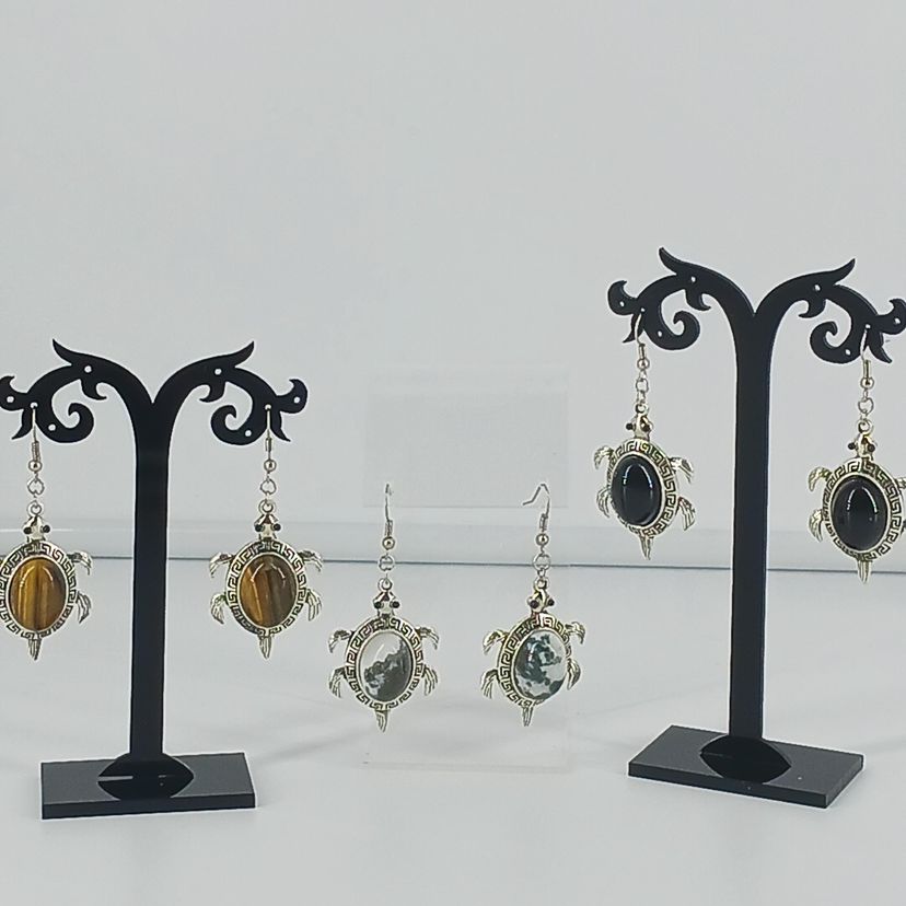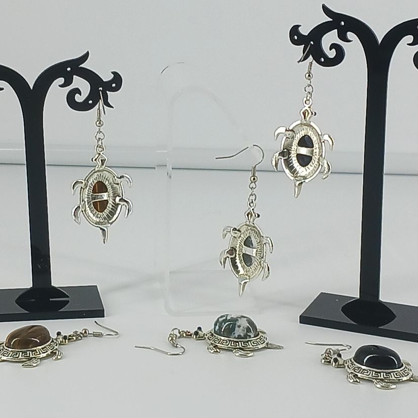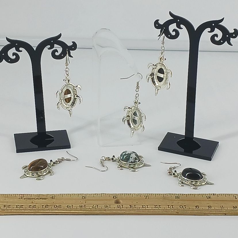 EM3060 – Black Onyx cabochon gemstone that measures 3/4x9/16x1/4 inch has been mounted into a Tibetan Silver open backed cabochon setting in the shape of a Turtle that measures 1 5/8x1 1/8 inch and has two black glass eye beads and is suspended from a stainless steel earring wire.