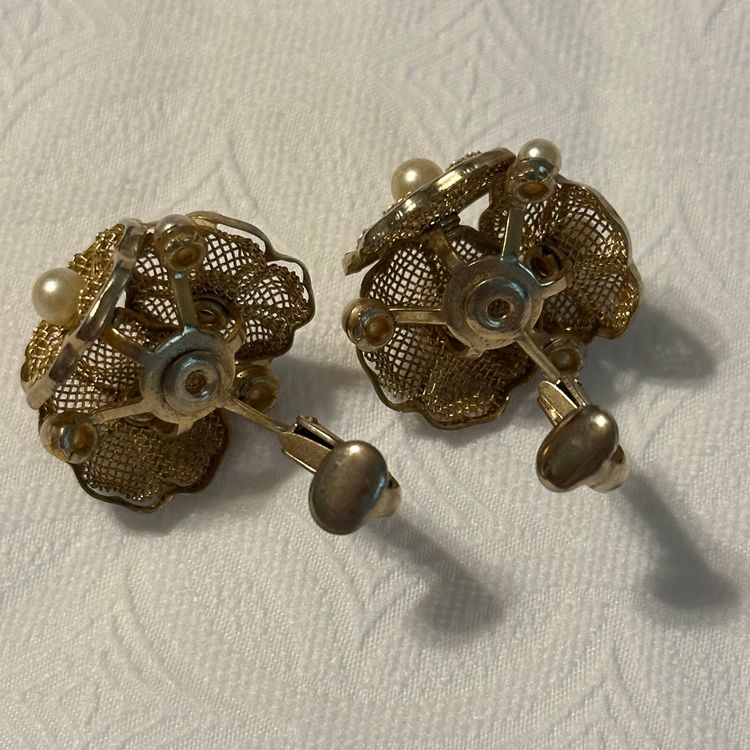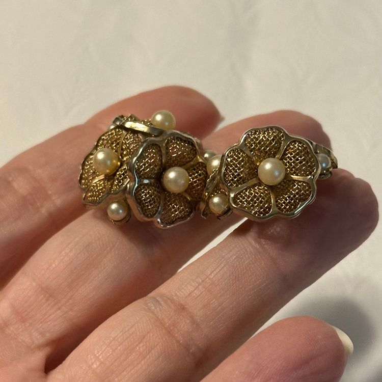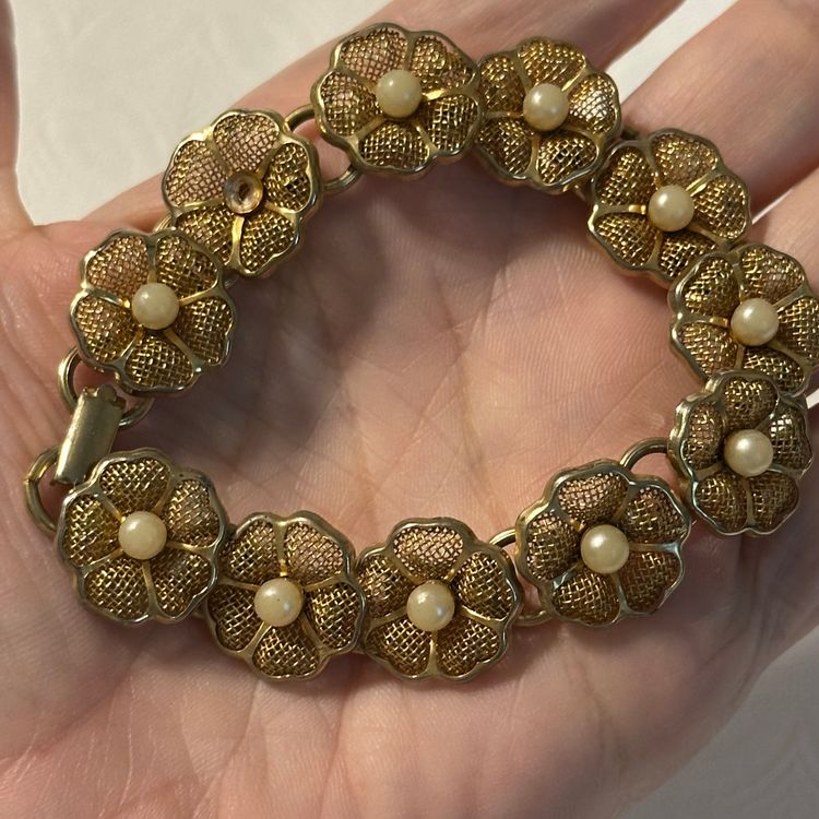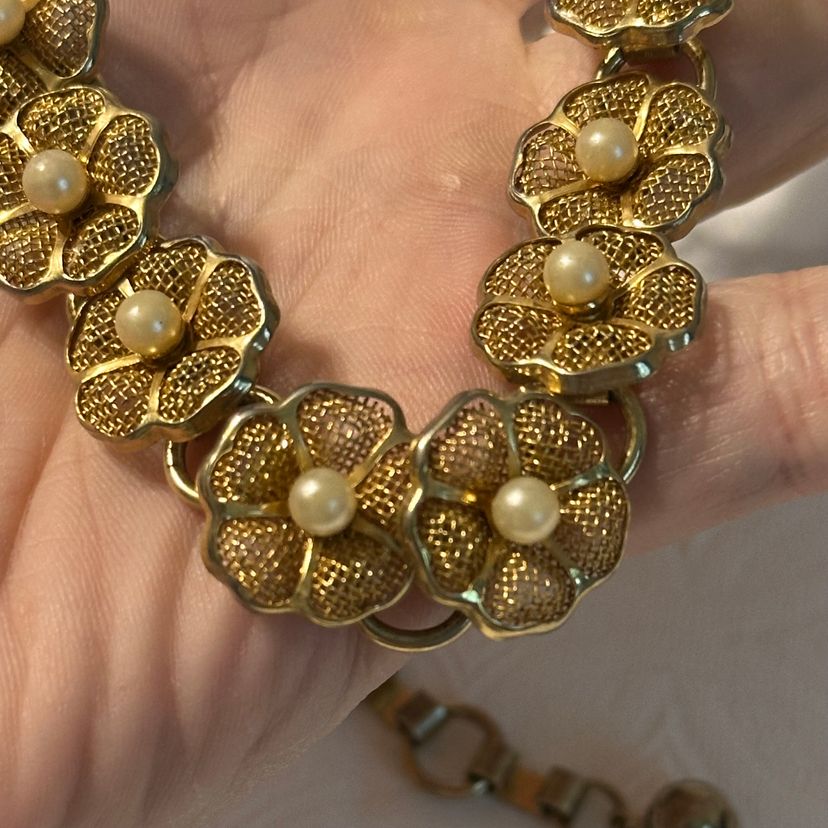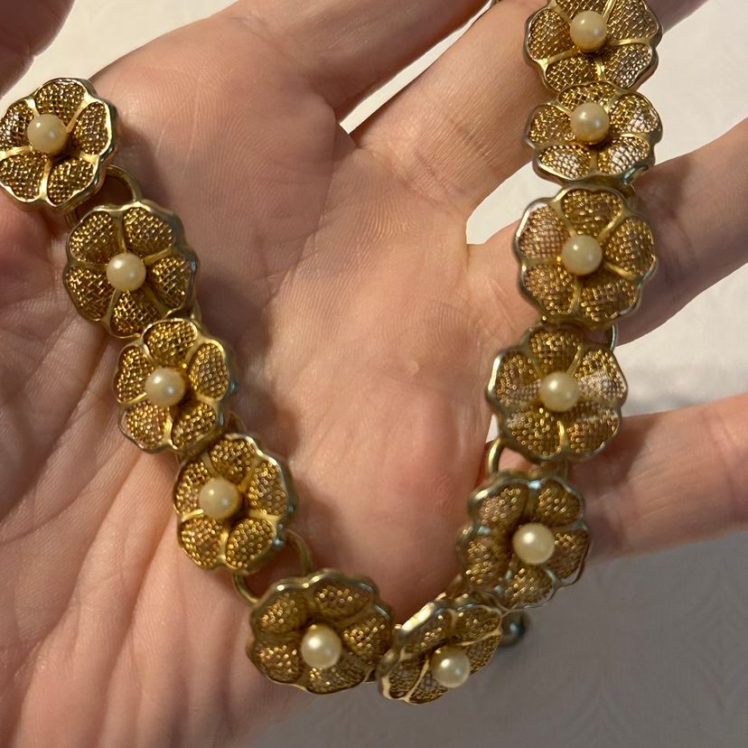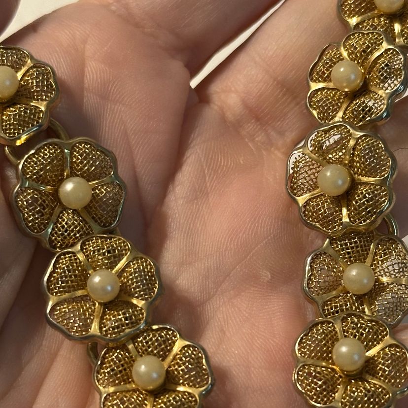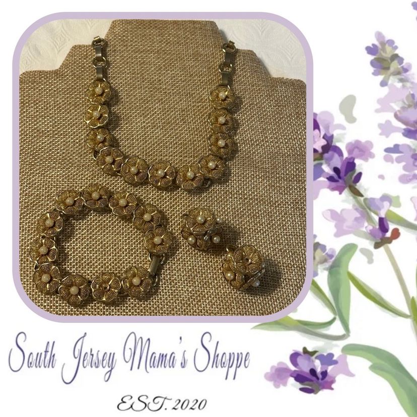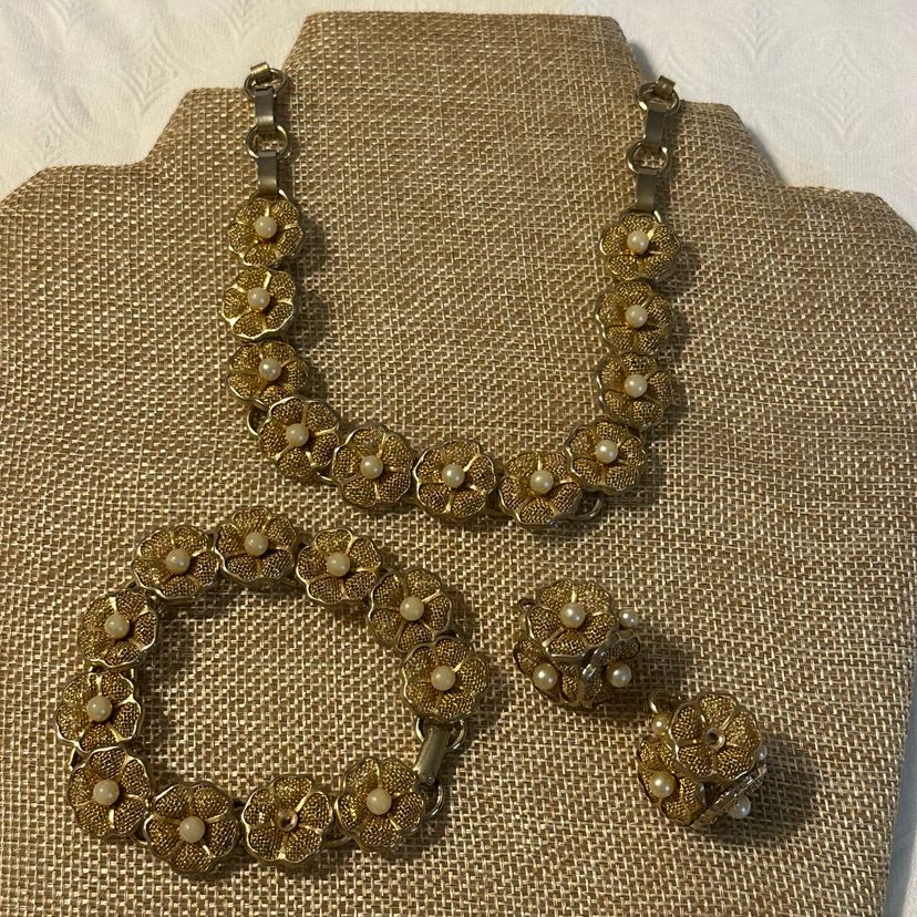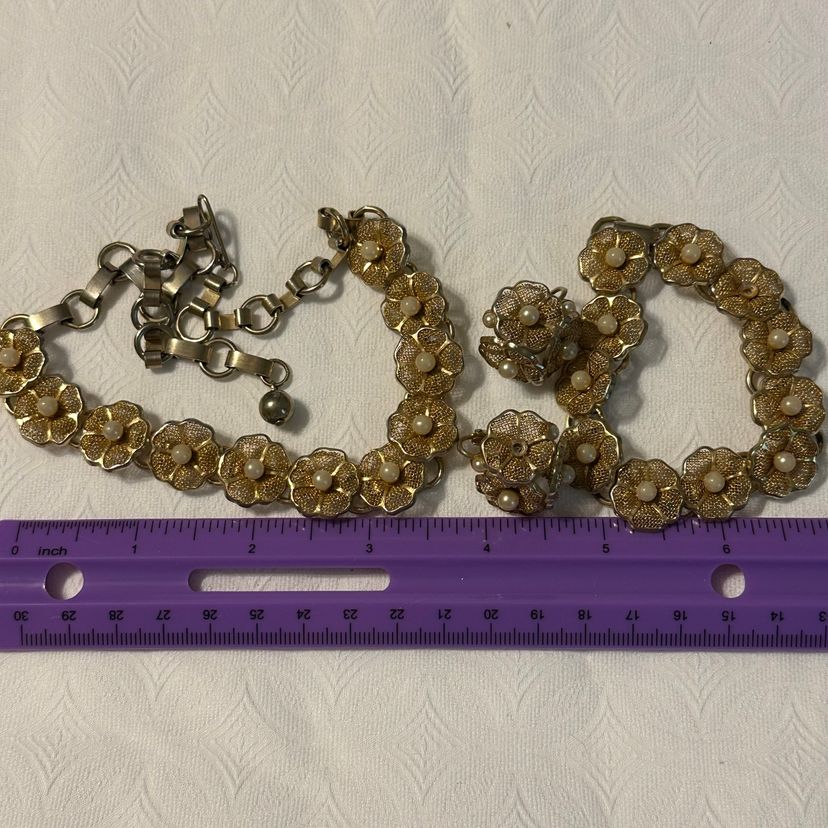 Pretty set! Bracelet is missing a pearl. One earring is also missing one. Minor metal wear. Overall, nice. Necklace 12” with 4” extender. Bracelet 7”