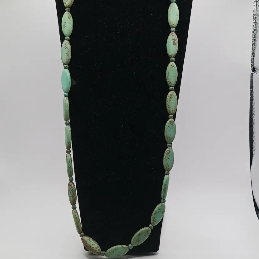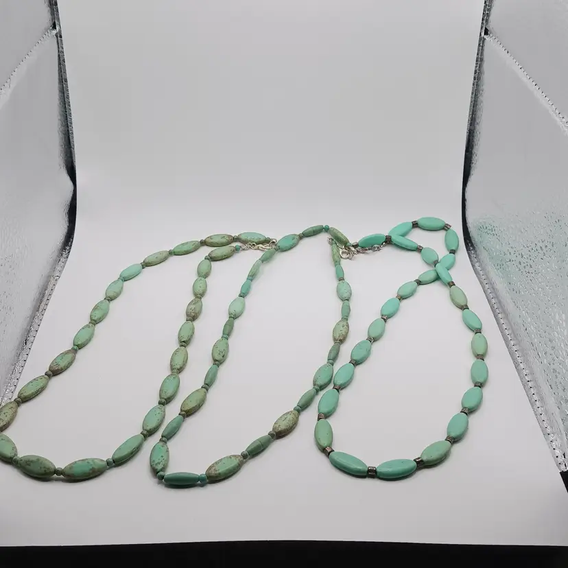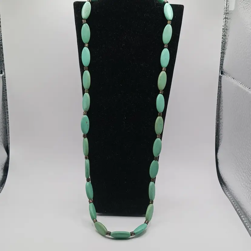 NAN512- ¾ x 3/8 inch Turquoise flat stones and 1/8 inch silver plated spacer beads make up this 22 inch necklace.