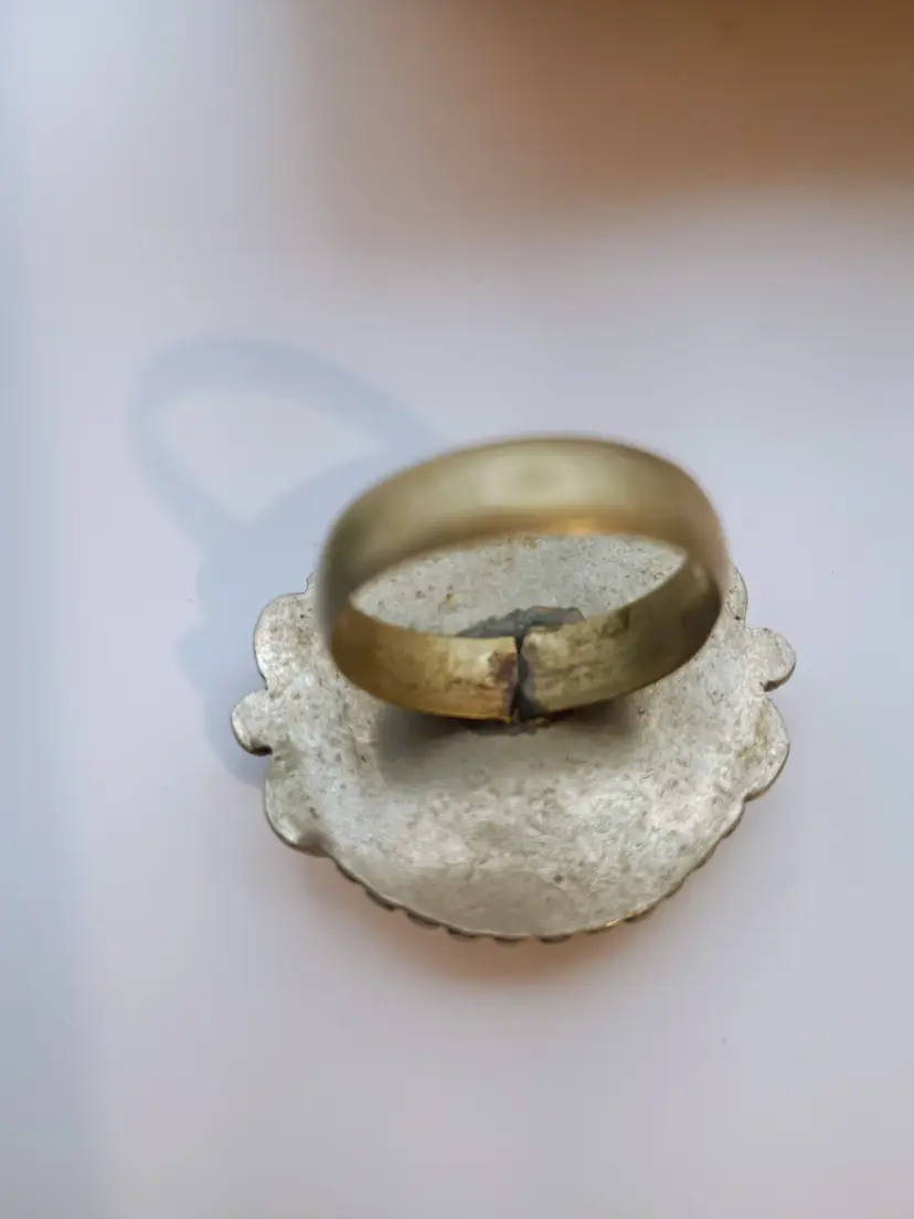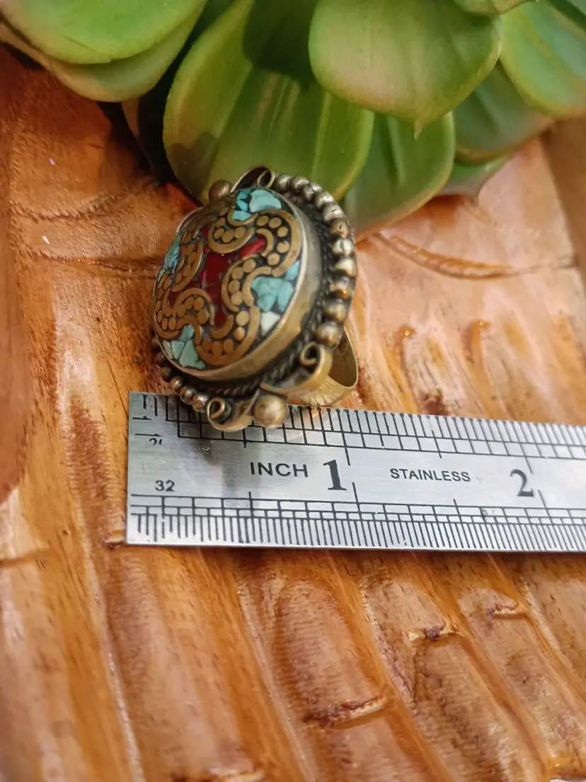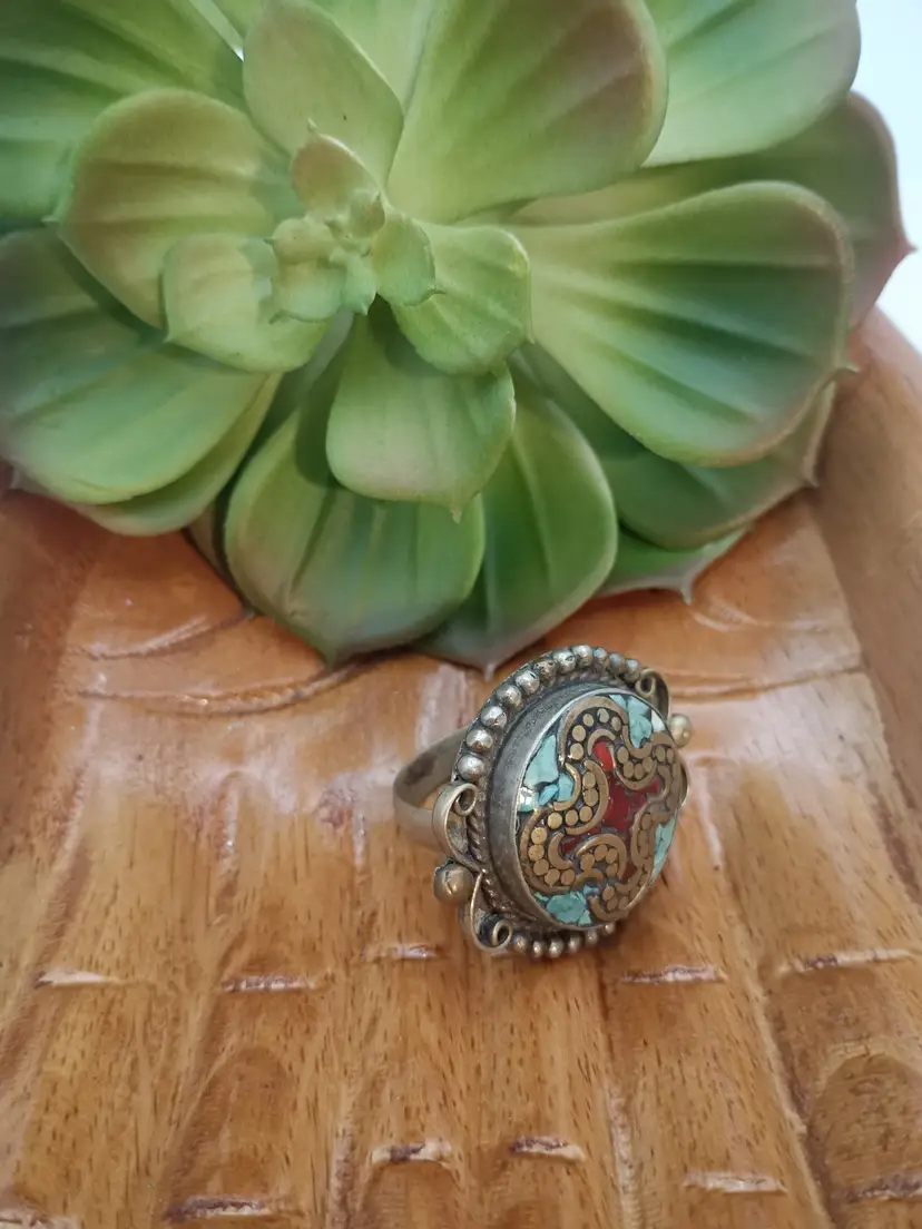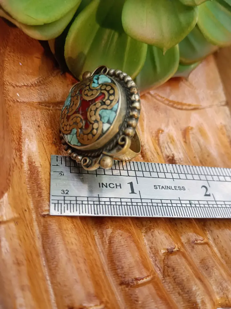 In this lot you will receive one vintage segmented turquoise and red coral size 8 ring. The front design is approximately 1.2 inches and has a cross motif. This ring will be a beautiful addition to anyone's collection. Let me know if you have any questions