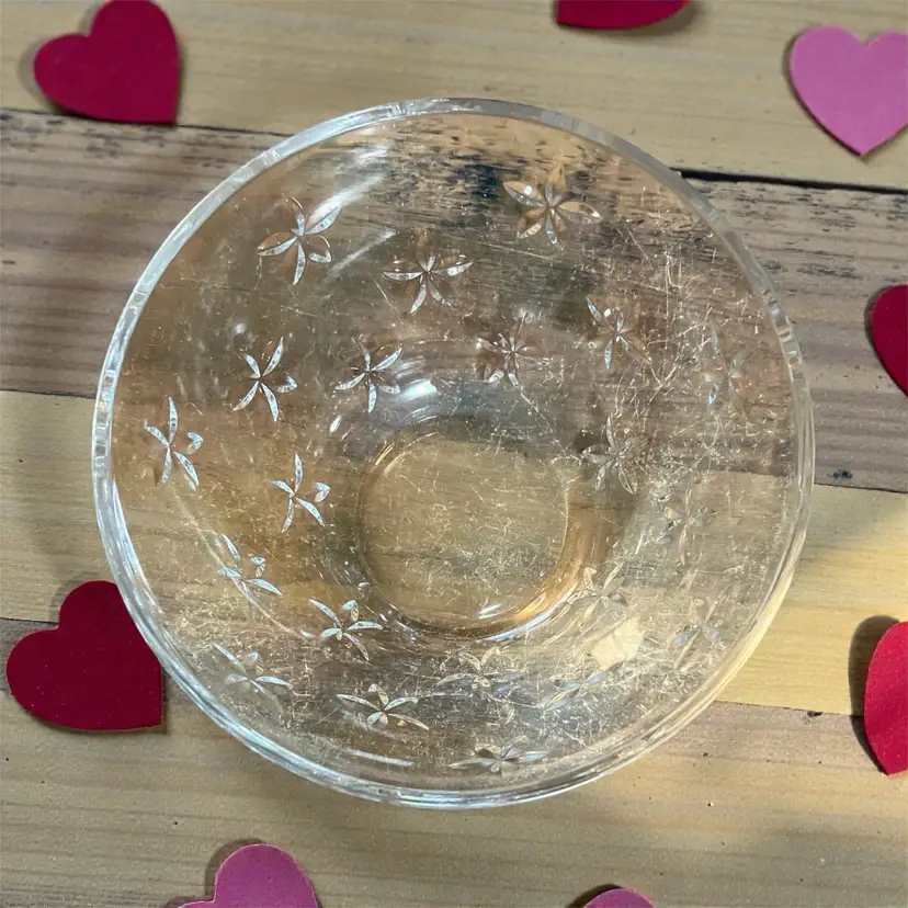 Preowned, no chips or cracks, some scuffs along flat bottom edge