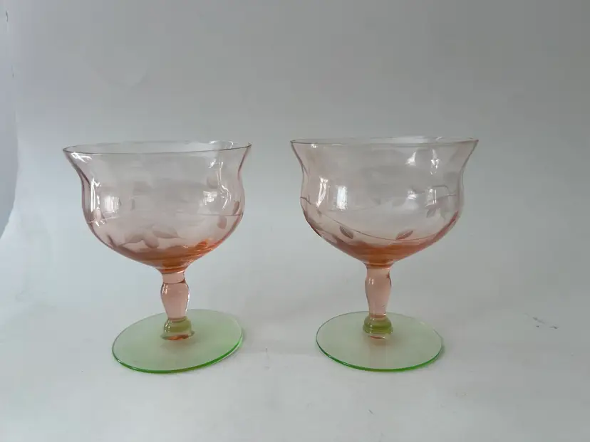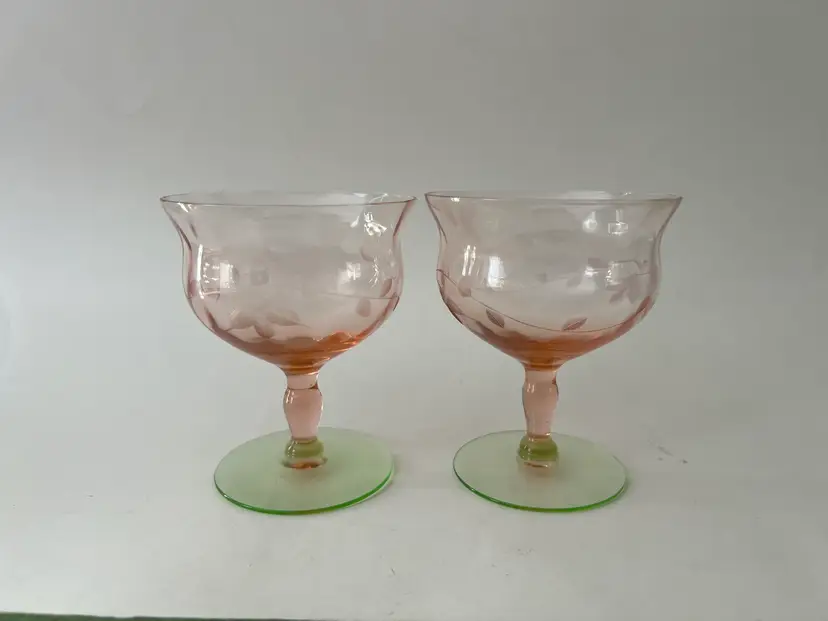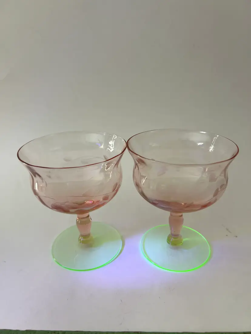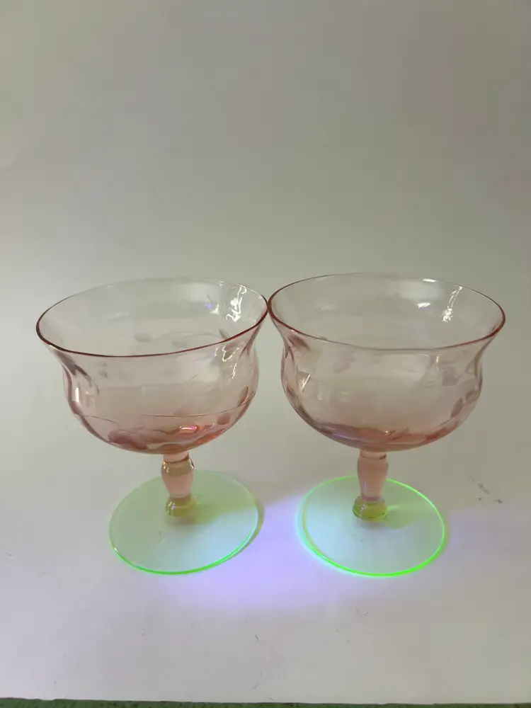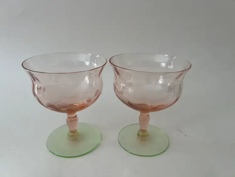 Beautiful matched pair of 4.25" tall depression wine / sherbet glasses. Stunning watermelon glass in light pink with a green base that glows under a black light. Likely made by Tiffin although Weston had very similar pieces. There are a couple bubbles in the glass. They are otherwise free of nicks, cracks or flea bites. Measurements- 4.25" tall x top diameter of 3.5"