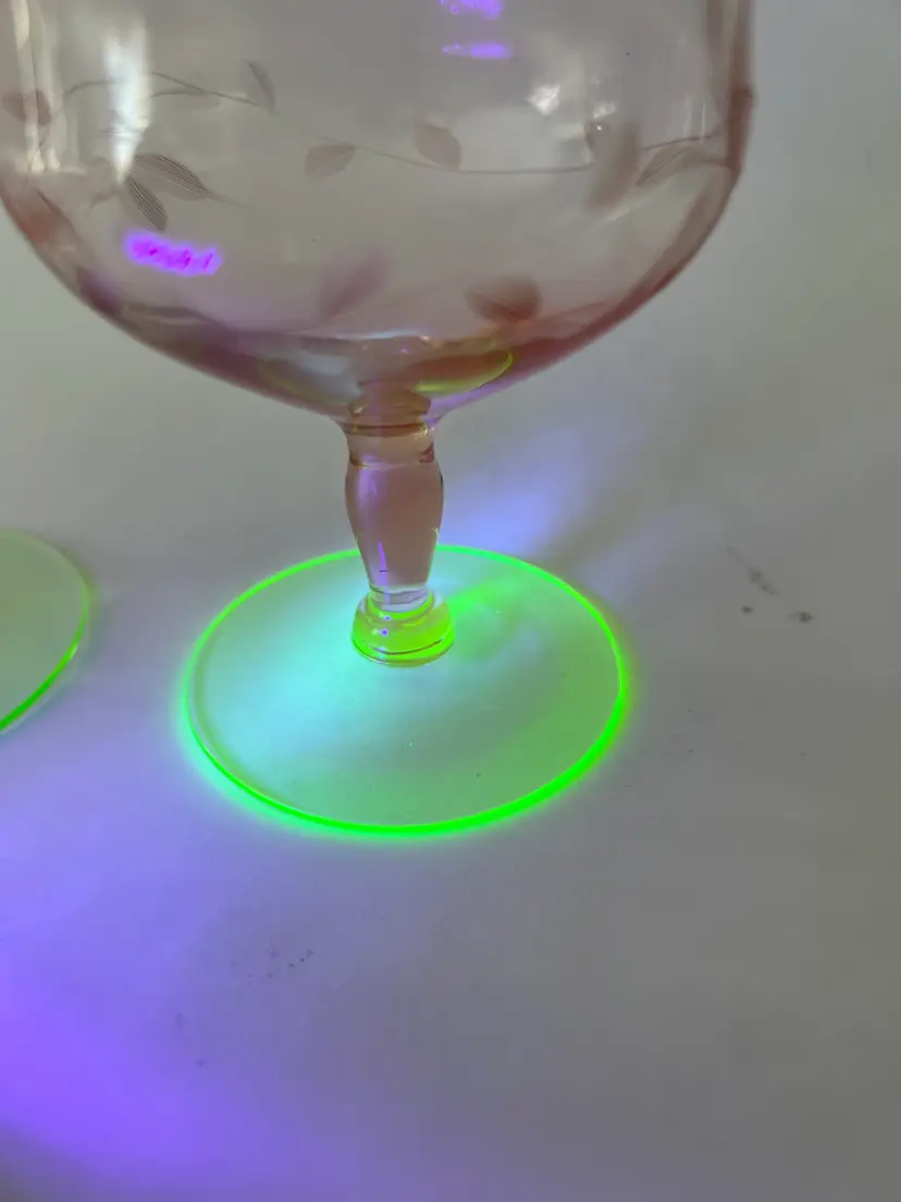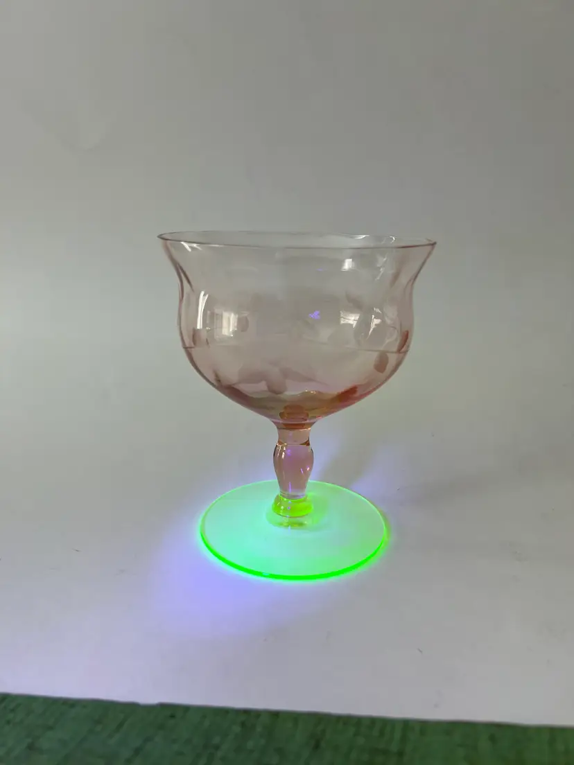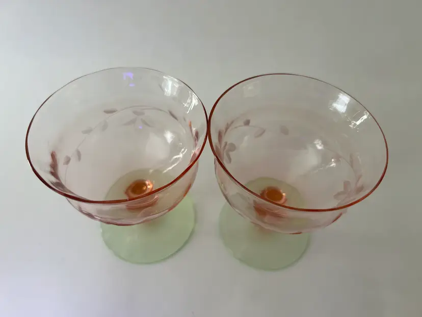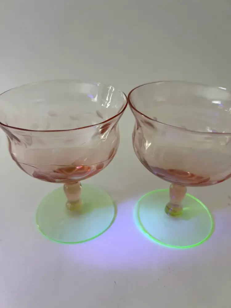 Beautiful matched pair of 4.25" tall depression wine / sherbet glasses. Stunning watermelon glass in light pink with a green base that glows under a black light. Likely made by Tiffin although Weston had very similar pieces. There are a couple bubbles in the glass. They are otherwise free of nicks, cracks or flea bites. Measurements- 4.25" tall x top diameter of 3.5"