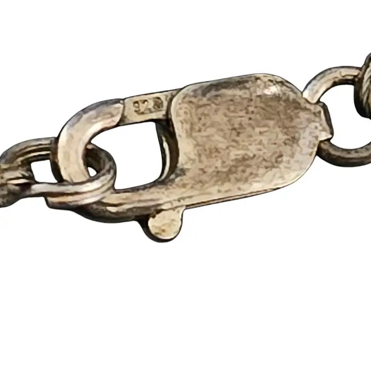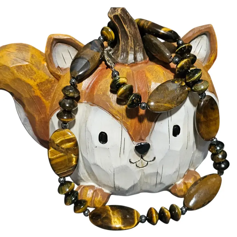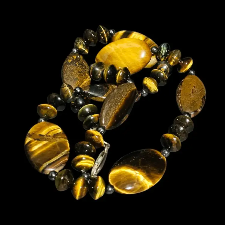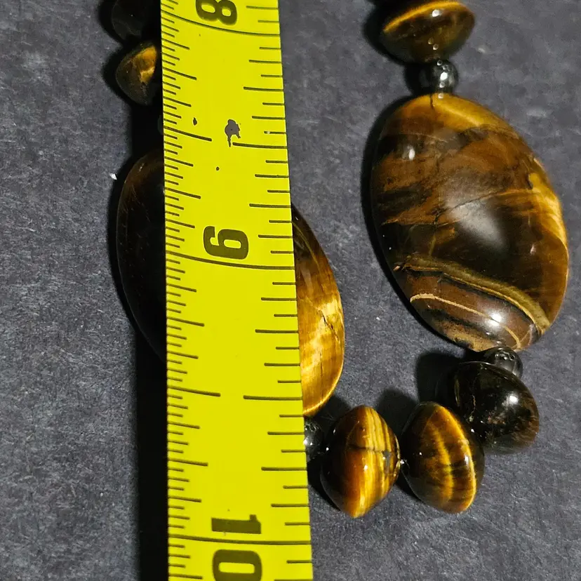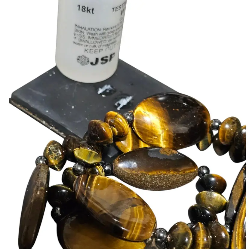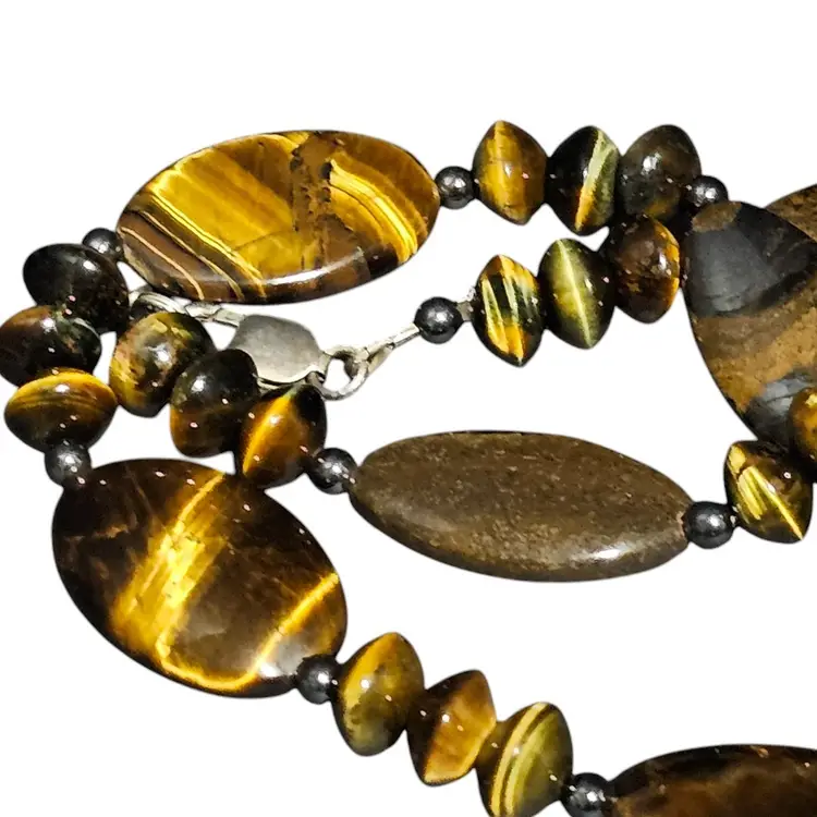 Polished oval and round Tigers Eye strung beaded necklace. The clasp was tested with JSP 18 Kt acid test. Tested positive to be sterling Silver. If you have any questions please feel free to message me on the community!