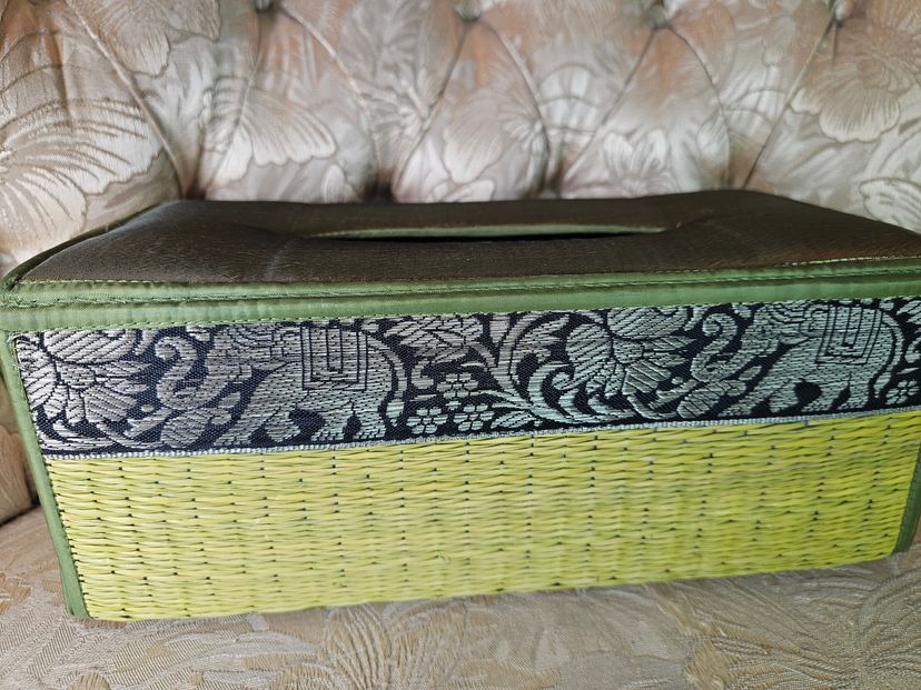 This Thai Tissue Box Cover is a stylish addition to any room in your home. Made from 100% natural materials such as silk and reed, it features a beautiful green color with intricate elephant designs. The rectangular shape and hook & loop closure make it easy to use and attach to your tissue box. This authentic Thai cover adds a touch of elegance to your bathroom, bedroom, or dining room decor. Crafted in Thailand, this original piece is perfect for adults looking to enhance their space with unique and cultural accents.