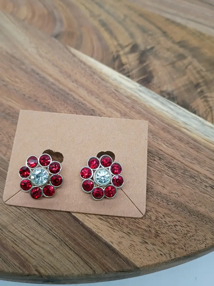 TJG The Jewelry Group Gold Tone Red and Clear Rhinestone Flower Shaped Clip on Earrings. Each earring is about 0.5 inches in diameter. This is preowned, No damage to metal, No broken or missing stones I'm pretty sure these are crystal rhinestones due to the light refractions. The clip on backs work smoothly and they are more modern circa late 1990's. Excellent condition. Ships USPS