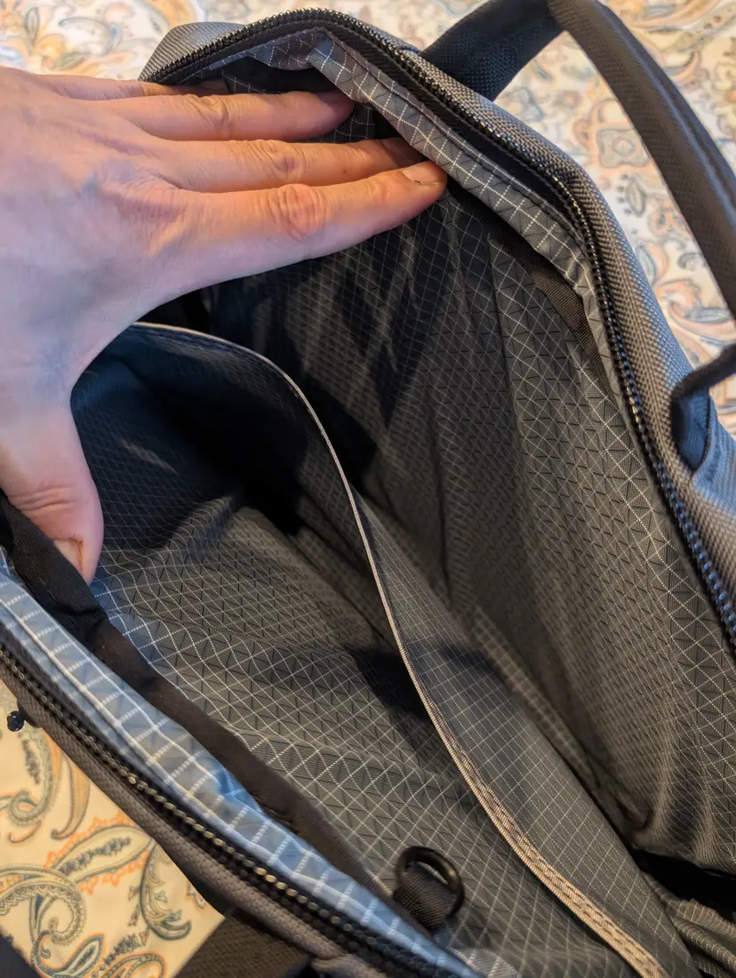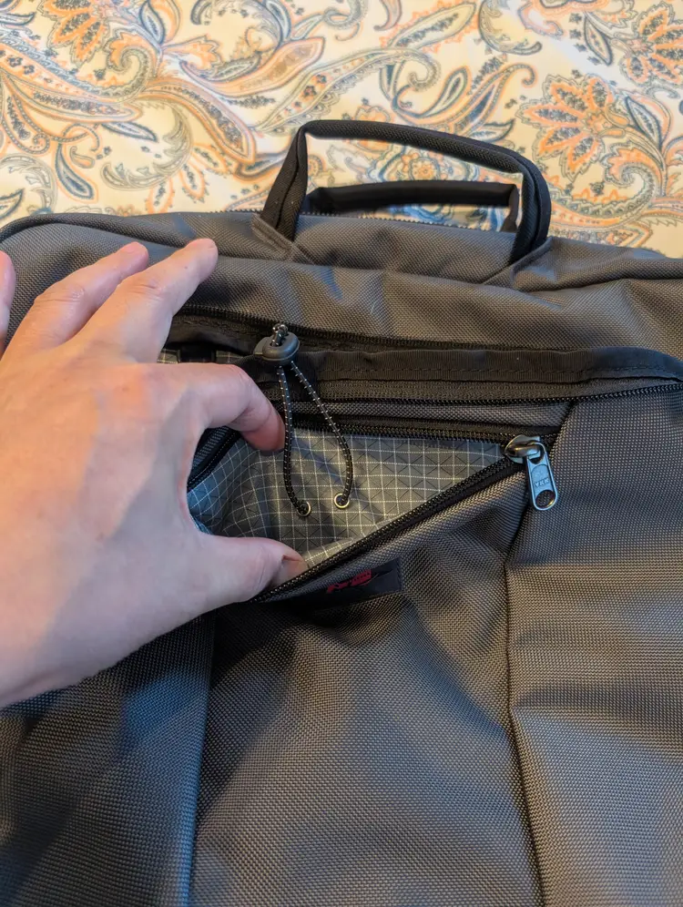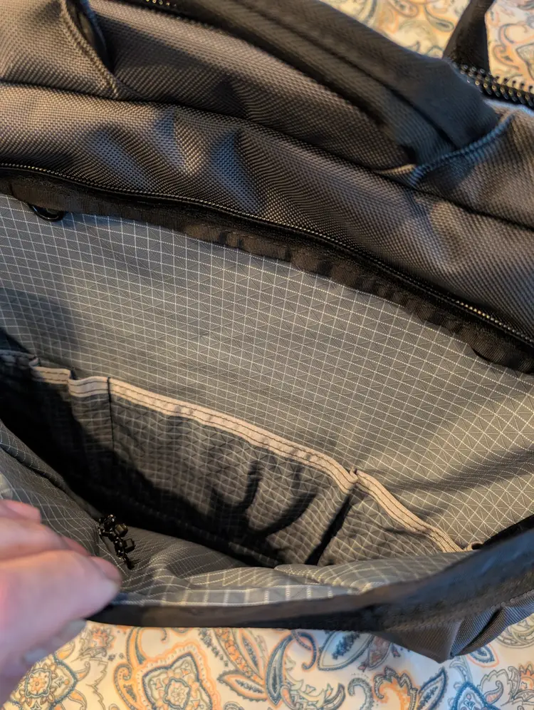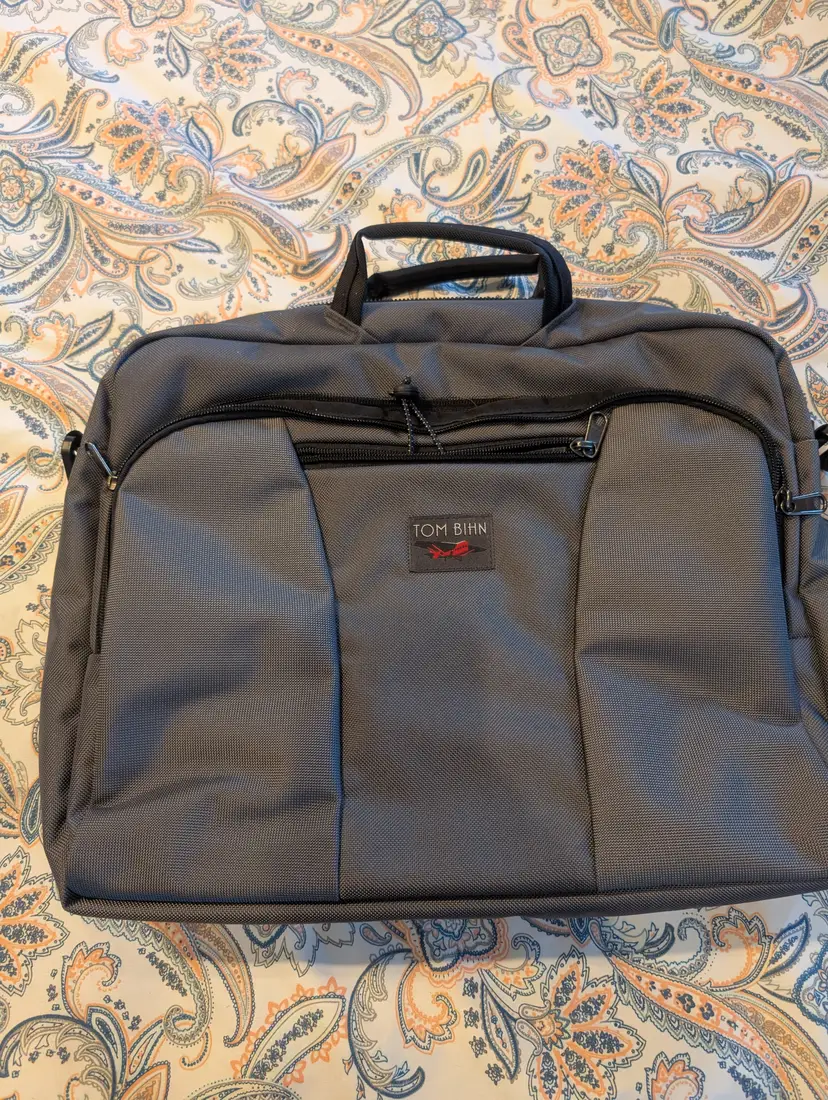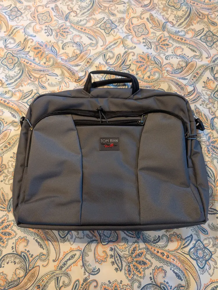 Tom Bihn Cadet - Nebulous Grey Ballistic/Northwest Sky 200 Halcyon (14 liters) I added a water bottle holder to the central water bottle pocket Removed some stitching to make several pen pockets to one large pocket (see pics) Excellent condition, no issues.