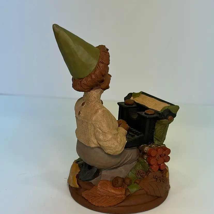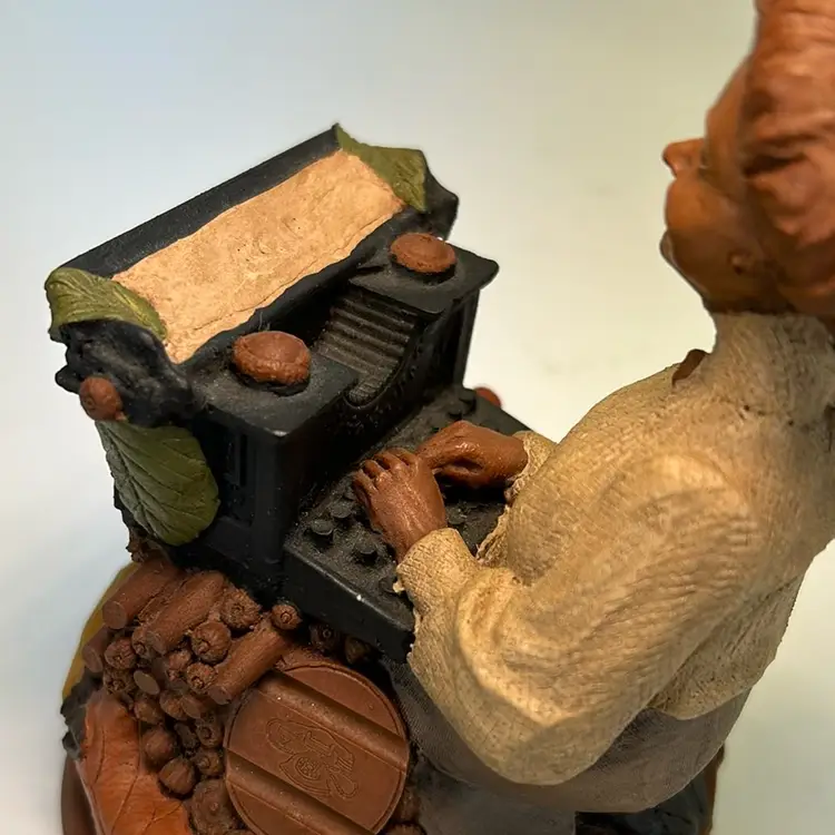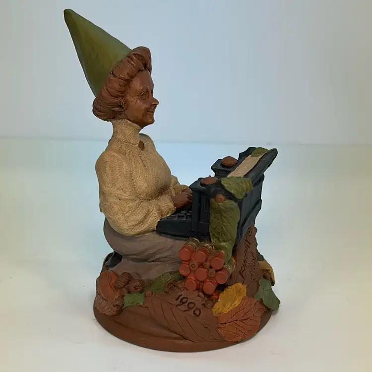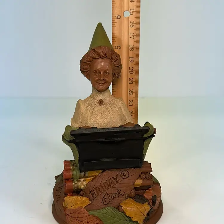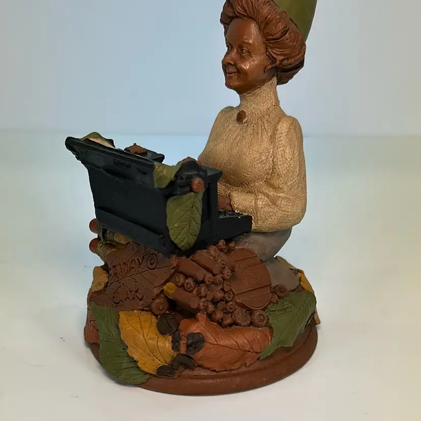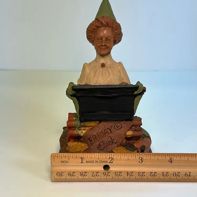 She is 5 3/4” tall and 3 3/4” wide at the base. There is a small paint scuff at the back of her hat. And a small paint chip on the typewriter.