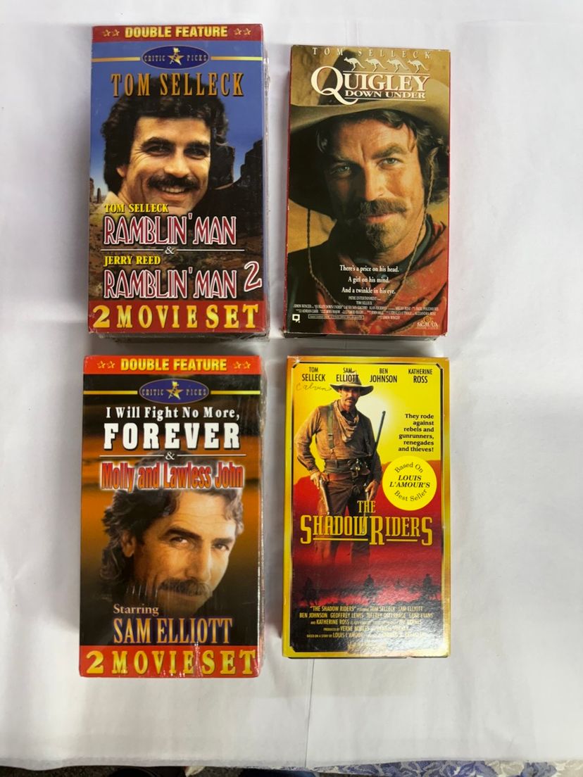 Small selection of VHS movies of Tom Selleck and Sam Elliot. 2 are new and 2 are slightly used