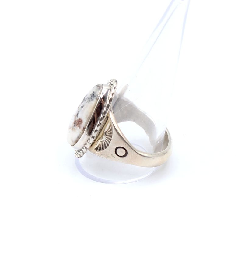 Beautiful ring signed TG assumed Tony Garcia to unknown artist. Stone is set in a smooth bezel with twisted wire design set on a hand stamp 5.49mm comfort band.