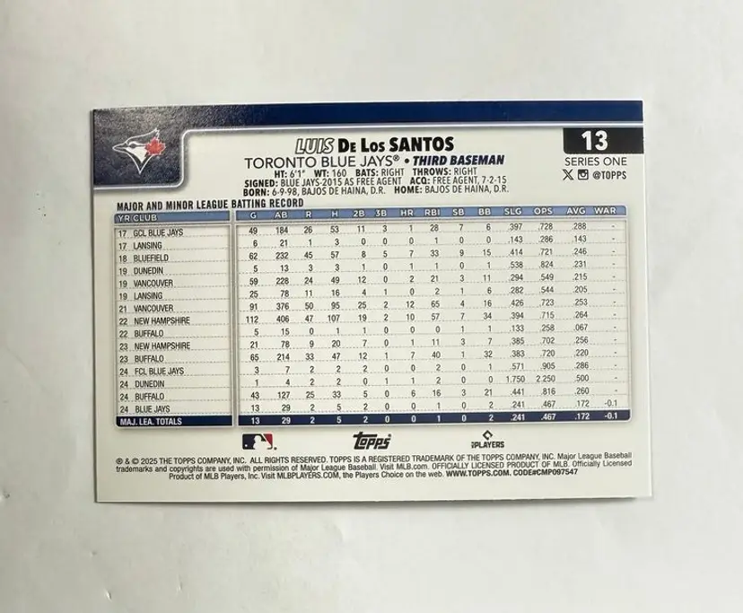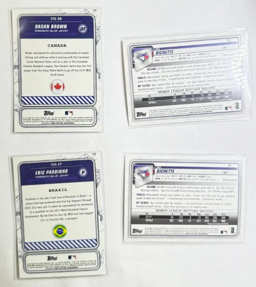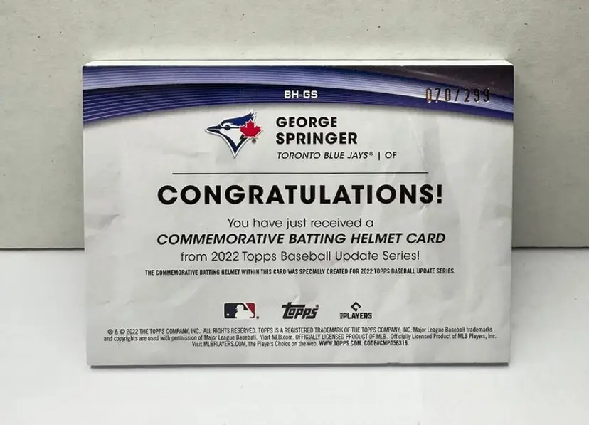 Luis De Los Santos 2025 Topps Series 1 Rainbow Foil #13 Bo Bichette 2020 Bowman RC #52 x2 George Springer 2022 Topps Update #BH-GS Batting Helmet 70/299 - Thick Card Dasan Brown 2020 Bowman Chrome Spring Training #STG-DB Eric Pardinho 2020 Bowman Chrome Spring Training #STG-EP